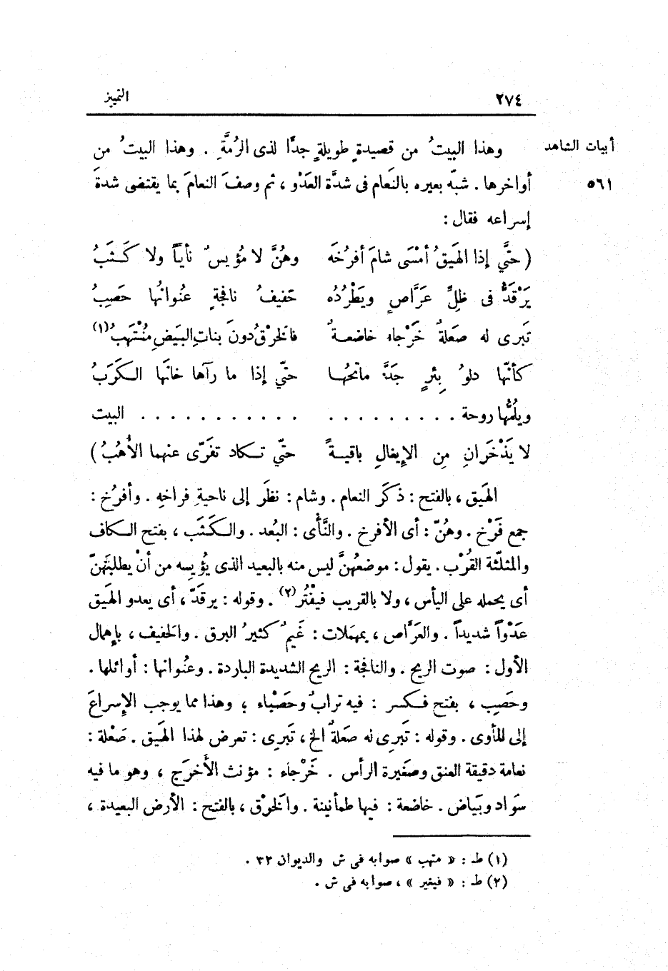 والنأي: الْبعد. والكثب بِفَتْح الْكَاف والمثلثة الْقرب. يَقُول: موضعهن لَيْسَ مِنْهُ بالبعيد الَّذِي يؤيسه من أَن يطلبهن أَي: يحملهُ على الْيَأْس وَلَا بالقريب فيفتر. وَقَوله: يرقد أَي: يعدو الهيق عدوا شَدِيدا. والعرّاص بمهملات: غيم كثير الْبَرْق. والحفيف بإهمال الأول: صَوت الرّيح.