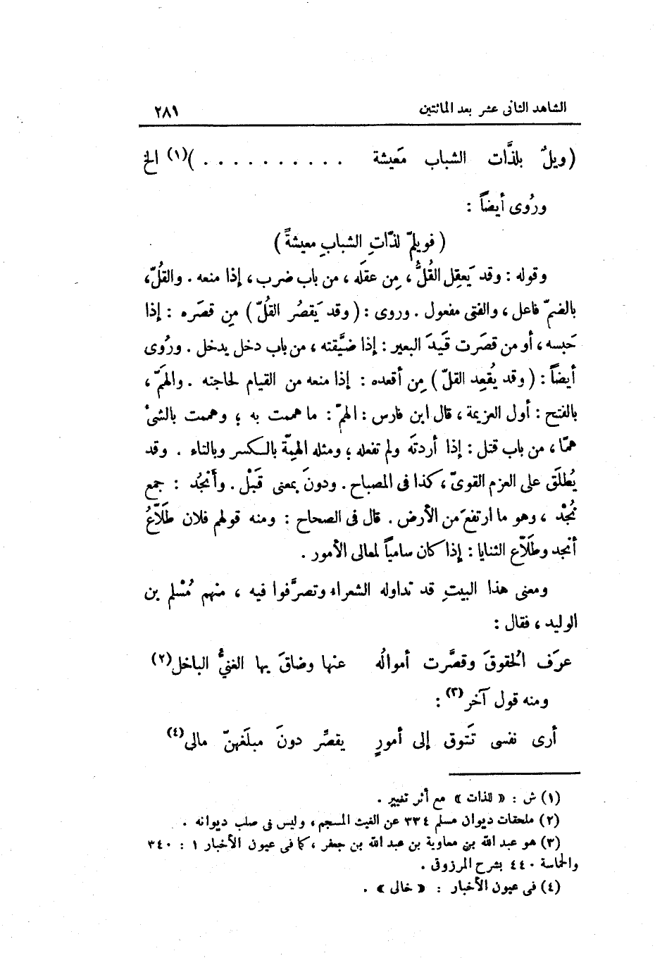 ويل بلذات الشَّبَاب معيشة فويلم لذات الشَّبَاب معيشة وَقَوله: وَقد يعقل القل من عقله من بَاب ضرب إِذا مَنعه. والقل بِالضَّمِّ فَاعل والفتى مفعول. وَرُوِيَ: وَقد يقصر القل من قصره: إِذا حَبسه أَو من قصرت قيد الْبَعِير: إِذا ضيقته من بَاب دخل يدْخل. وَرُوِيَ أَيْضا: وَقد يقْعد القل من أقعده: إِذا مَنعه من الْقيام لِحَاجَتِهِ.