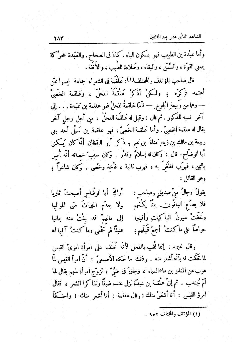 ذكره وَلَكِن أذكر عَلْقَمَة الْفَحْل وعلقمة الْخصي وهما من ربيعَة الْجُوع فَأَما عَلْقَمَة الْفَحْل فَهُوَ عَلْقَمَة بن عَبدة ... إِلَى آخر نسبه الْمَذْكُور. ثمَّ قَالَ: وَقيل لَهُ عَلْقَمَة الْفَحْل من أجل رجل آخر يُقَال لَهُ عَلْقَمَة الْخصي.