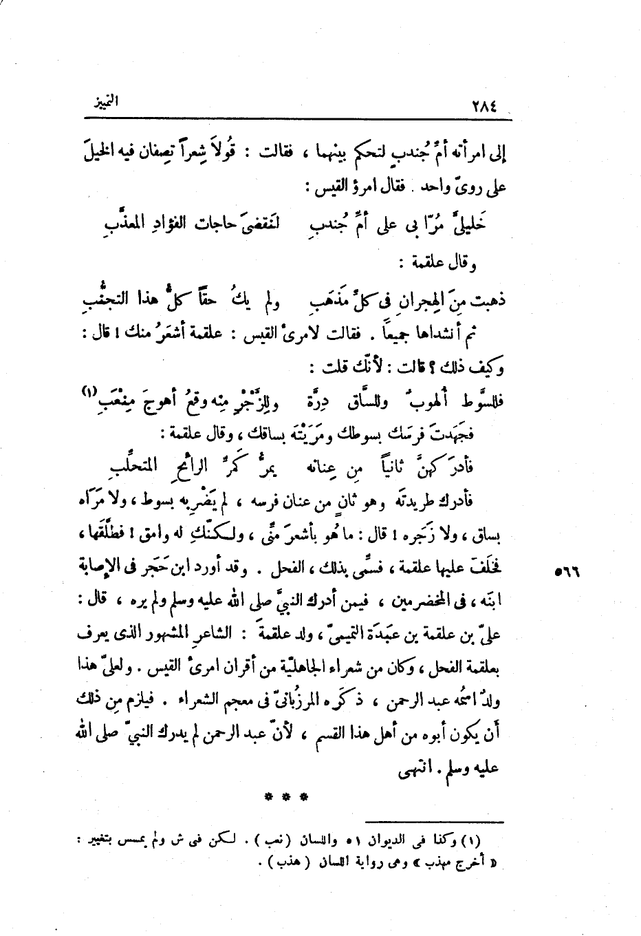 ثمَّ أنشداها جَمِيعًا. فَقَالَت لامرىء الْقَيْس: عَلْقَمَة أشعر مِنْك قَالَ: وَكَيف ذَلِك قَالَت: لِأَنَّك قلت: