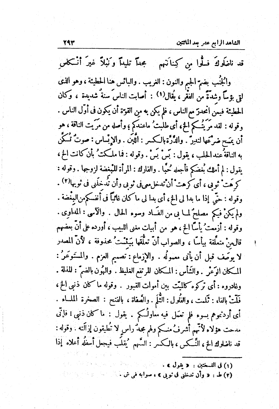 وَالْجنب بِضَم الْجِيم وَالنُّون: الْغَرِيب. والبائس: هُنَا الحطيئة وَهُوَ الَّذِي لَقِي بؤساً وشدّة من الْفقر يُقَال: أَصَابَت النَّاس سنة شَدِيدَة وَكَانَ الحطيئة فِيمَن انحدر مَعَ النَّاس فَلم يكن بِهِ من الْقُوَّة أَن يكون فِي أوّل النَّاس. وَقَوله: لقد مريتكم الخ أَي: طلبت مَا عنْدكُمْ وَأَصله من مريت)