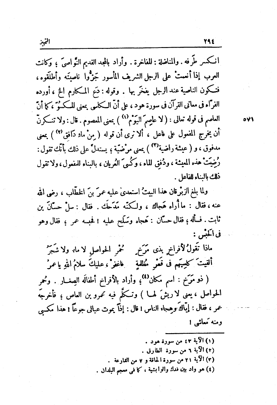 على أَن الكاسي بِمَعْنى المكسو كَمَا أَن العاصم فِي قَوْله تَعَالَى: لَا عَاصِم الْيَوْم بِمَعْنى الْمَعْصُوم. قَالَ: وَلَا تنكرن أَن يخرج الْمَفْعُول على فَاعل إِلَّا ترى أَن قَوْله من مَاء دافق بِمَعْنى مدفوق وعيشة راضية بِمَعْنى مرضية يسْتَدلّ على ذَلِك بأنك تَقول: رضيت هَذِه الْمَعيشَة ودفق المَاء وكسي الْعُرْيَان بِالْبِنَاءِ للْمَفْعُول وَلَا تَقول ذَلِك بِالْبِنَاءِ للْفَاعِل.