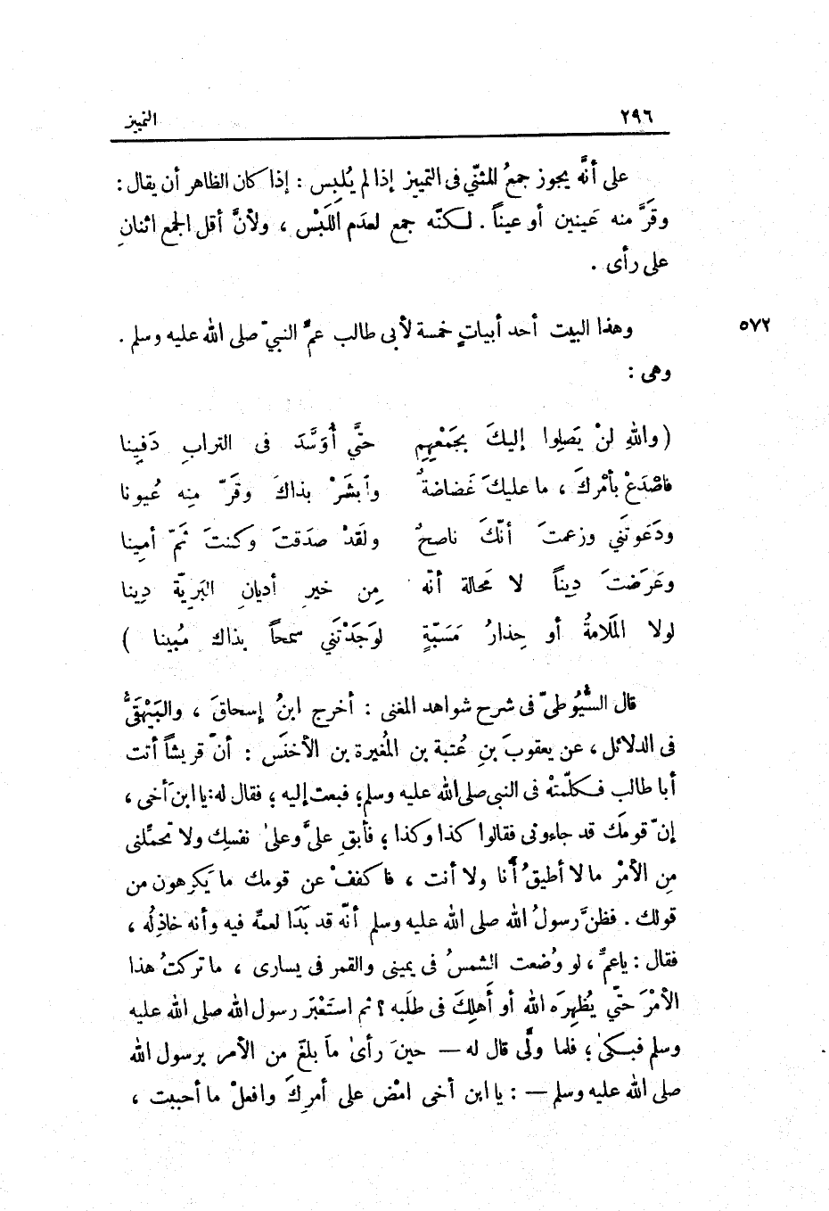 قَالَ السُّيُوطِيّ فِي شرح شَوَاهِد الْمُغنِي: أخرج ابْن إِسْحَاق وَالْبَيْهَقِيّ فِي الدَّلَائِل عَن يَعْقُوب بن عتبَة بن الْمُغيرَة بن الْأَخْنَس: أَن قُريْشًا أَتَت أَبَا طَالب فكلمته فِي النَّبِي صَلَّى اللَّهُ عَلَيْهِ وَسَلَّم َ فَبعث إِلَيْهِ فَقَالَ لَهُ: يَا ابْن أخي إِن قَوْمك قد جاؤوني فَقَالُوا كَذَا وَكَذَا فأبق عَليّ وعَلى نَفسك وَلَا تحملنِي من الْأَمر مَا لَا أُطِيق أَنا وَلَا أَنْت فَاكْفُفْ عَن قَوْمك مَا يكْرهُونَ من قَوْلك فَظن رَسُول الله صَلَّى اللَّهُ عَلَيْهِ وَسَلَّم َ أَنه قد بدا لِعَمِّهِ فِيهِ وَأَنه خاذله فَقَالَ: يَا عَم لَو وضعت الشَّمْس فِي يَمِيني وَالْقَمَر فِي يساري مَا تركت هَذَا الْأَمر حَتَّى يظهره الله أَو أهلك فِي طلبه ثمَّ استعبر رَسُول الله صَلَّى اللَّهُ عَلَيْهِ وَسَلَّم َ فَبكى فَلَمَّا ولى قَالَ لَهُ حِين رأى مَا بلغ من الْأَمر برَسُول الله صَلَّى اللَّهُ عَلَيْهِ وَسَلَّم َ: يَا ابْن أخي امْضِ على أَمرك وَافْعل مَا أَحْبَبْت
