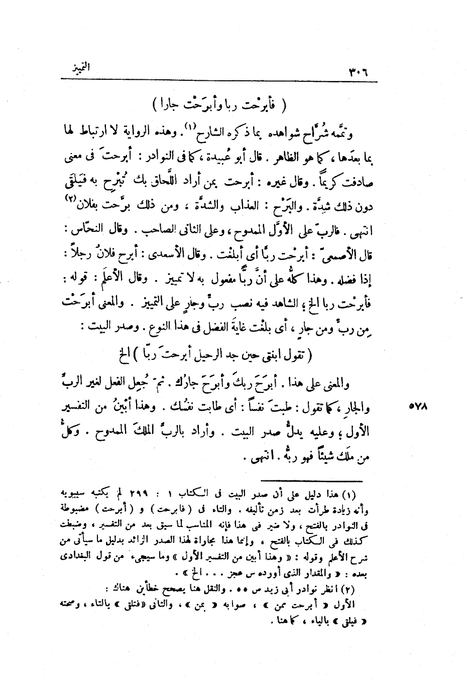 وَقَالَ الأعلم: قَوْله: فأبرحت رَبًّا الخ الشَّاهِد فِيهِ نصب ربّ وَدَار على التَّمْيِيز. وَالْمعْنَى أبرحت من ربّ وَمن جَار أَي: بلغت غَايَة الْفضل فِي هَذَا النَّوْع. وَصدر الْبَيْت: تَقول ابْنَتي حِين جدّ الرحيل أبرحت ربّاً)