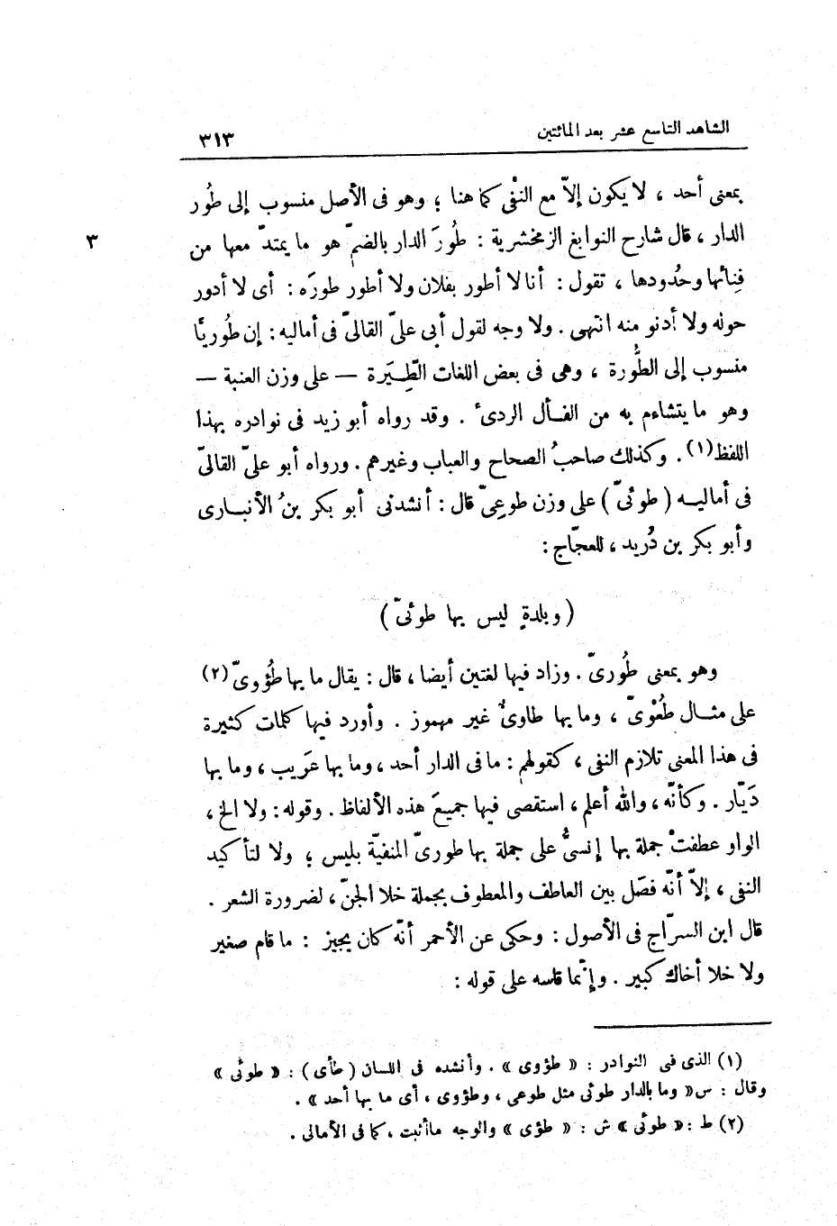 وَلَا وَجه لقَوْل أبي عَليّ القالي فِي أَمَالِيهِ: إِن طورياً مَنْسُوب إِلَى الطورة وَهِي فِي بعض اللُّغَات الطّيرة على وزن العنبة وَهُوَ مَا يتشاءم بِهِ من الفأل الرَّدِيء. وَقد رَوَاهُ أَبُو زيد فِي نوادره بِهَذَا اللَّفْظ. وَكَذَلِكَ صَاحب الصِّحَاح والْعباب وَغَيرهم. وَرَوَاهُ أَبُو عَليّ القالي فِي أَمَالِيهِ طوئي على وزن طوعي قَالَ: أَنْشدني أَبُو بكر بن الْأَنْبَارِي وَأَبُو بكر بن دُرَيْد للعجّاج: وبلدة لَيْسَ بهَا طوئيّ وَهُوَ بِمَعْنى طوري. وَزَاد فِيهَا لغتين أَيْضا قَالَ: يُقَال: مَا بهَا طؤويّ على مِثَال طعويّ وَمَا بهَا طاويّ غير مَهْمُوز. وَأورد فِيهَا كَلِمَات كَثِيرَة فِي هَذَا الْمَعْنى