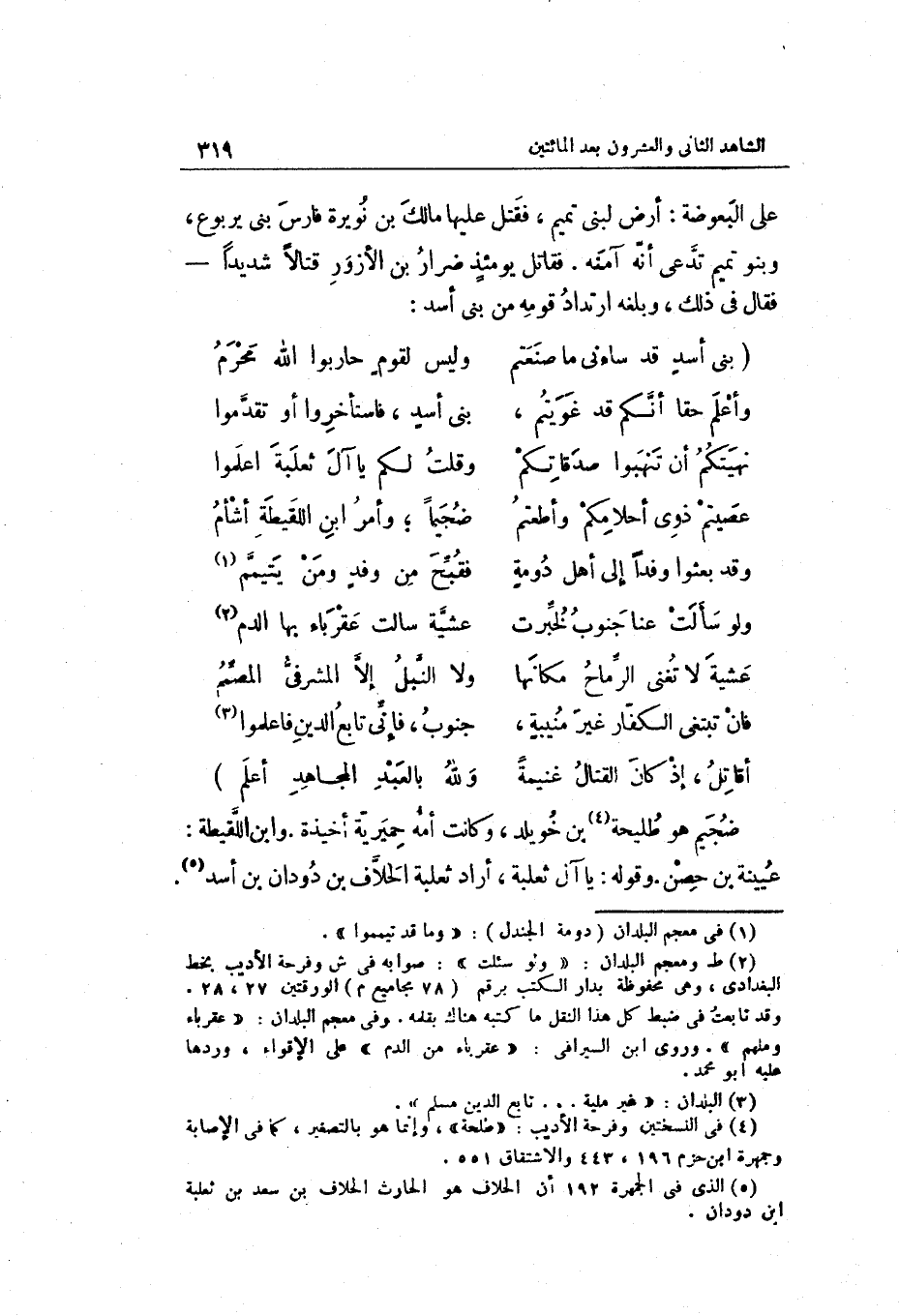 وَقَوله: يَا آل ثَعْلَبَة أَرَادَ ثَعْلَبَة الحلاف بن دودان بن أَسد.