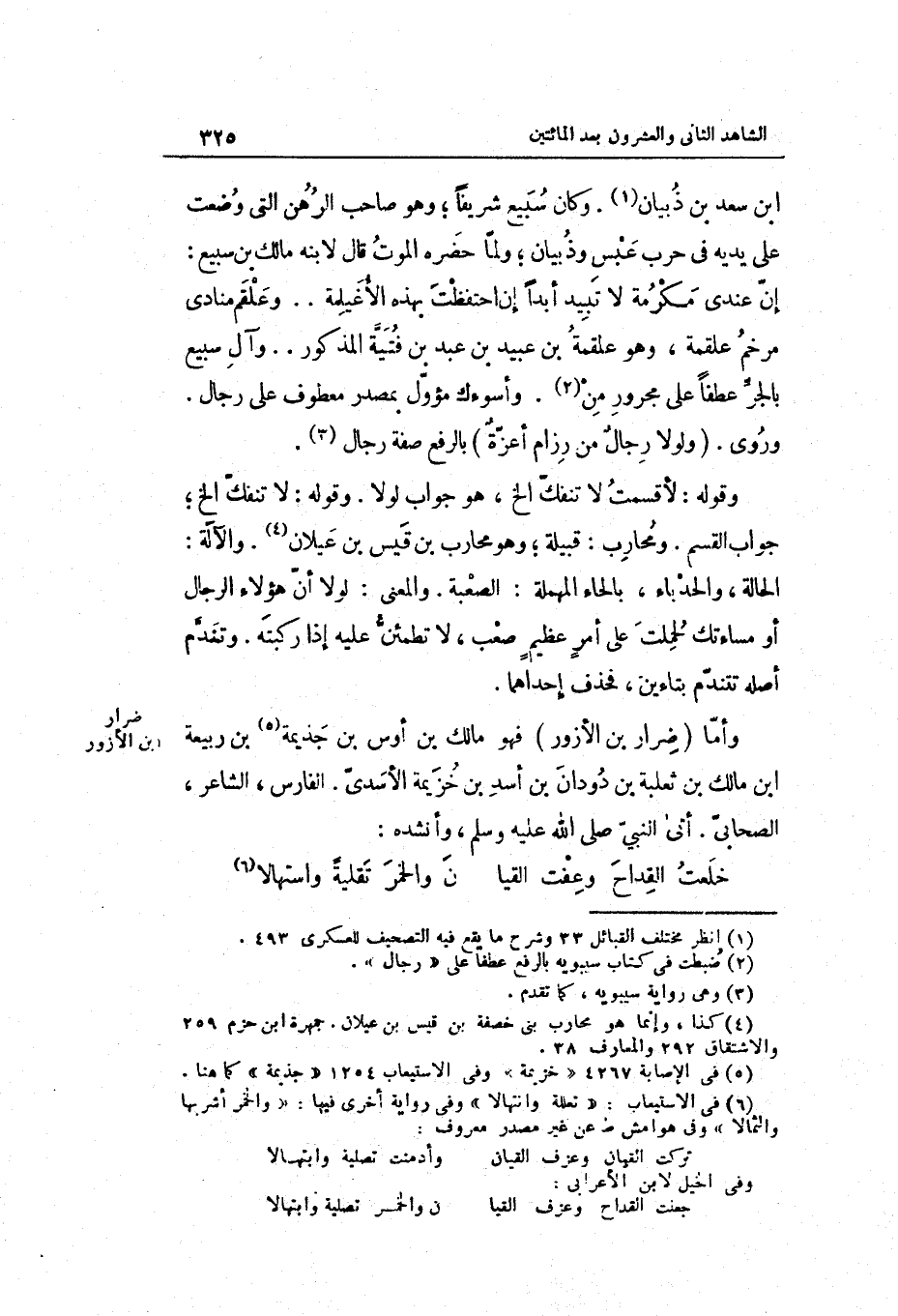 بن سعد بن ذبيان. وَكَانَ سبيع شريفاً وَهُوَ صَاحب الرَّهْن الَّتِي وضعت على يَدَيْهِ فِي حَرْب عبس وذبيان وَلما حَضَره الْمَوْت قَالَ لِابْنِهِ مَالك بن سبيع: إِن عِنْدِي مكرمَة لَا تبيد أبدا إِن احتفظت بِهَذِهِ الأغيلمة. . وعلقم منادى مرخّم عَلْقَمَة وَهُوَ عَلْقَمَة بن عبيد بن عبد بن فتية الْمَذْكُور. . وَآل سبيع بِالْجَرِّ عطفا على مجرور من. وأسوءك مؤول بمصدر مَعْطُوف على وَقَوله: لأقسمت لَا تنفك الخ هُوَ جَوَاب لَوْلَا. وَقَوله: لَا تنفك الخ جَوَاب الْقسم. ومحارب:)