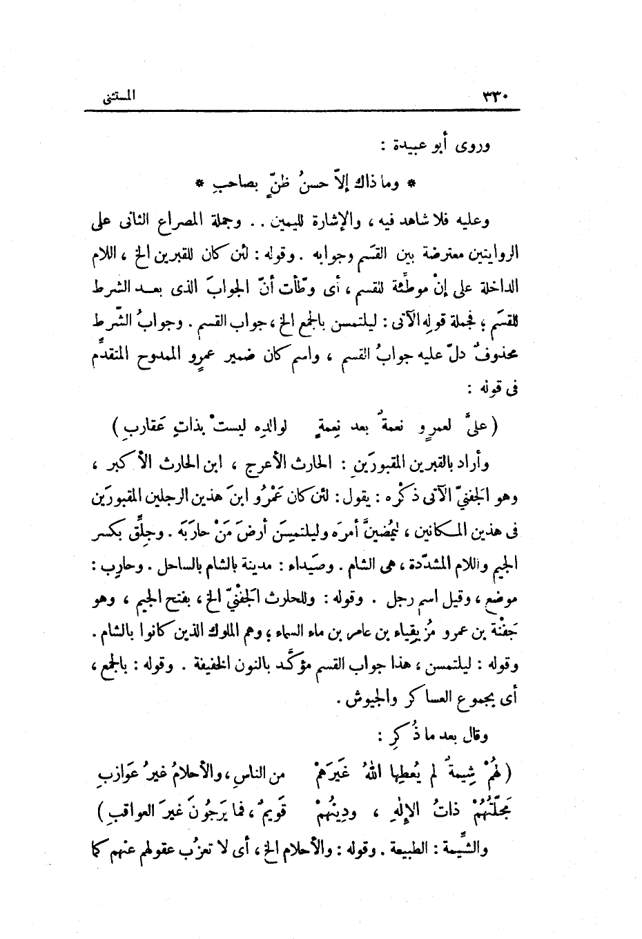 وروى أَبُو عُبَيْدَة: وَمَا ذَاك إِلَّا حسن ظن بِصَاحِب وَعَلِيهِ فَلَا شَاهد فِيهِ وَالْإِشَارَة للْيَمِين. . وَجُمْلَة المصراع الثَّانِي على الرِّوَايَتَيْنِ مُعْتَرضَة بَين الْقسم وَجَوَابه. وَقَوله: لَئِن كَانَ للقبرين الخ اللَّام الدَّاخِلَة على إِن موطئة للقسم أَي: وطأت أَن الْجَواب الَّذِي بعد الشَّرْط للقسم فجملة قَوْله الْآتِي: ليلتمسن بِالْجمعِ الخ جَوَاب الْقسم. وَجَوَاب الشَّرْط مَحْذُوف دلّ عَلَيْهِ جَوَاب الْقسم وَاسم كَانَ ضمير عَمْرو الممدوح الْمُتَقَدّم فِي قَوْله: