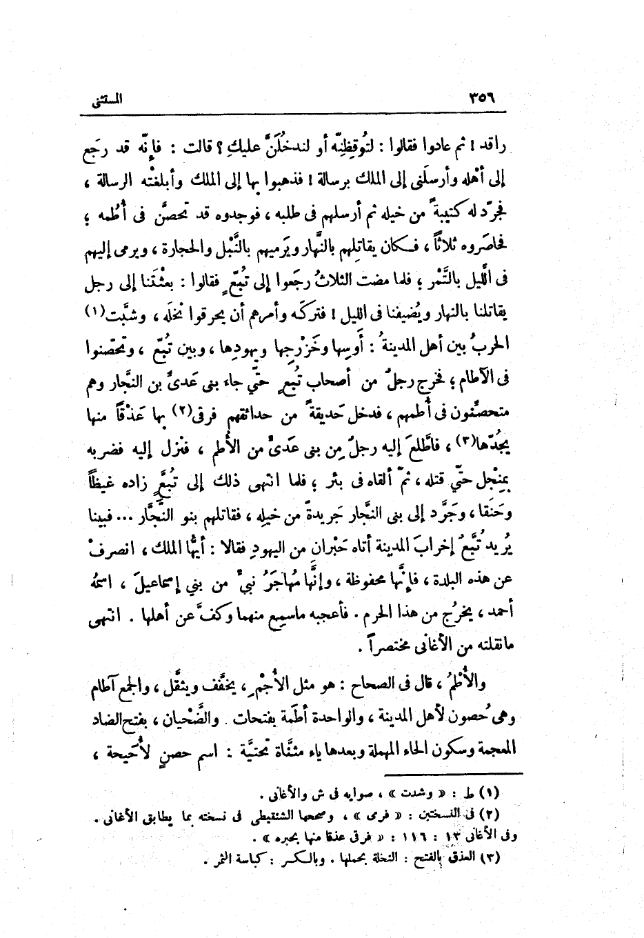 فَلَمَّا مَضَت الثَّلَاث رجعُوا إِلَى تبع فَقَالُوا: بعثتنا إِلَى رجل يقاتلنا بِالنَّهَارِ ويضيفنا فِي اللَّيْل فَتَركه وَأمرهمْ أَن يحرقوا نخله وشبّت الْحَرْب بَين أهل الْمَدِينَة: اوسها وخزرجها ويهودها وَبَين تبّع وتحصنوا فِي الْآطَام فَخرج رجل من أَصْحَاب تبّع حَتَّى جَاءَ بني عدي بن النجار وهم متحصنون فِي أطمهم فَدخل حديقة من حدائقهم فرقي بهَا عذقاً مِنْهَا يجدّها فَاطلع إِلَيْهِ رجل من بني عدي من الأطم فَنزل إِلَيْهِ فَضَربهُ بمنجل حَتَّى قَتله ثمَّ أَلْقَاهُ فِي بِئْر فَلَمَّا انْتهى ذَلِك لى تبّع زَاده غيظاً وحنقاً وجرد إِلَى بني النجار جَرِيدَة من خيله فَقَاتلهُمْ بَنو النجار ... فَبينا يُرِيد تبع إخراب الْمَدِينَة اتاه حبران من الْيَهُود فَقَالَا: أَيهَا الْملك انْصَرف عَن هَذِه الْبَلدة فَإِنَّهَا مَحْفُوظَة وَإِنَّهَا مهَاجر نَبِي من بني إِسْمَاعِيل اسْمه أَحْمد يخرج من هَذَا الْحرم. فأعجبه مَا سمع مِنْهُمَا وكفّ عَن أَهلهَا. انْتهى مَا نقلته من الأغاني مُخْتَصرا.