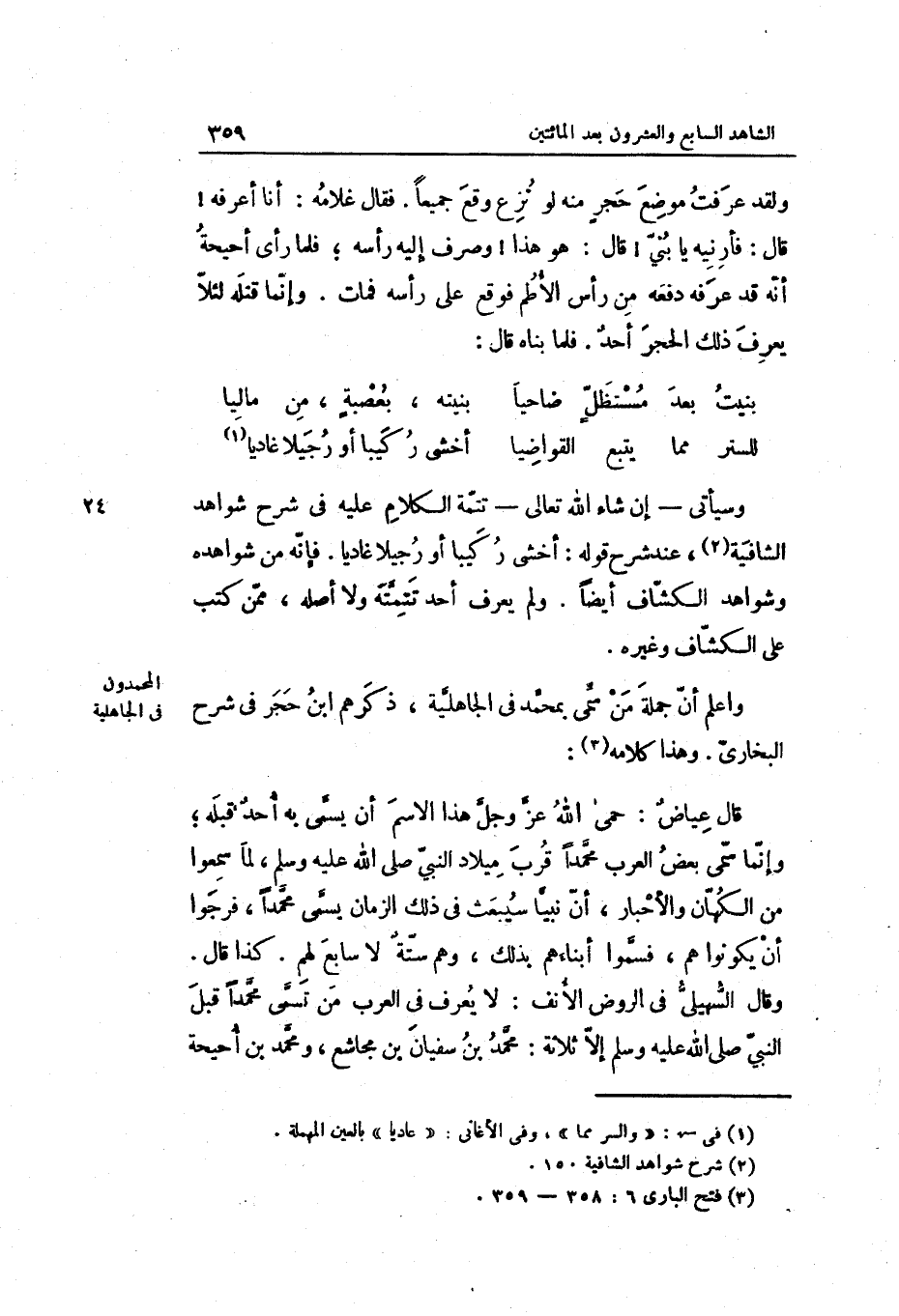 وَاعْلَم أَن جملَة من سمي بِمُحَمد فِي الْجَاهِلِيَّة ذكرهم ابْن حجر فِي شرح البُخَارِيّ. وَهَذَا كَلَامه: قَالَ عِيَاض: حمى الله عَزَّ وَجَلَّ هَذَا الِاسْم أَن يُسمى بِهِ أحد قبله وَإِنَّمَا سمى بعض الْعَرَب مُحَمَّدًا قرب مِيلَاد النَّبِي صَلَّى اللَّهُ عَلَيْهِ وَسَلَّم َ لما سمعُوا من الْكُهَّان والأحبار أَن نَبيا سيبعث فِي ذَلِك الزَّمَان يُسمى مُحَمَّدًا فَرجوا أَن يَكُونُوا هم فسموا أَبْنَاءَهُم بذلك وهم سِتَّة لَا سَابِع لَهُم. كَذَا قَالَ.