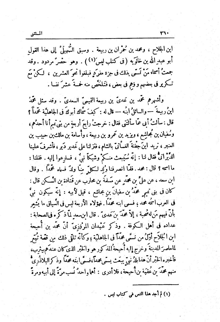 بن الجلاح وَمُحَمّد بن حمْرَان بن وَسبق السُّهيْلي إِلَى هَذَا القَوْل أَبُو عبد الله بن خالويه فِي متاب لَيْسَ. وَهُوَ حصر مَرْدُود. وَقد جمعت أَسمَاء من تسمى بذلك فِي جُزْء مُفْرد فبلغوا نَحْو الْعشْرين لَكِن مَعَ تَكْرِير فِي بَعضهم وَوهم فِي بعض فتلخص مِنْهُ خَمْسَة عشر نفسا.