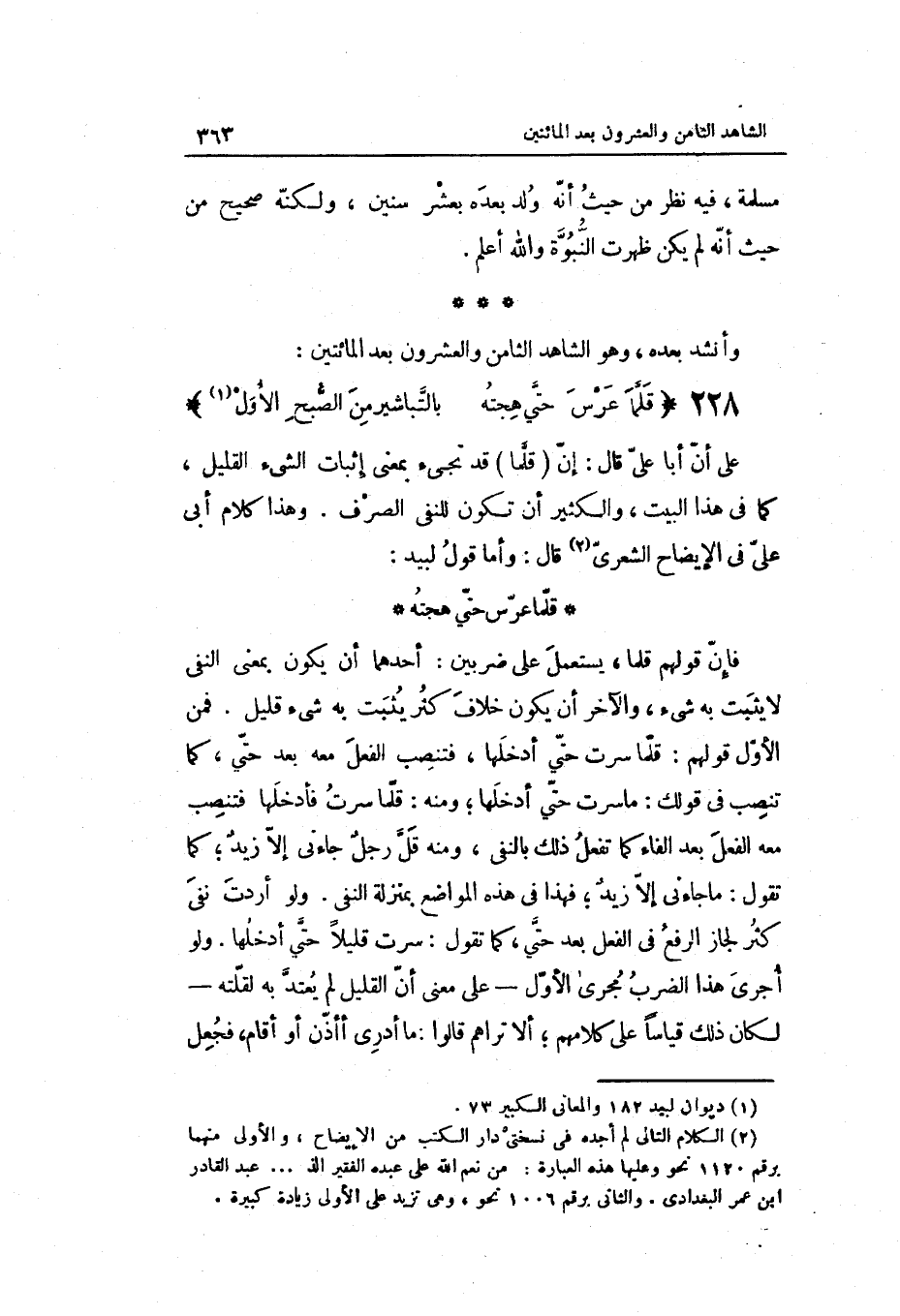 على أَن أَبَا عَليّ قَالَ: إِن قَلما قد تَجِيء بِمَعْنى إِثْبَات الشَّيْء الْقَلِيل كَمَا فِي هَذَا الْبَيْت وَالْكثير أَن تكون للنَّفْي الصّرْف. وَهَذَا كَلَام أبي عَليّ فِي الْإِيضَاح الشعري قَالَ: وَأما قَول لبيد: قَلما عرس حَتَّى هجته فَإِن قَوْلهم قَلما يسْتَعْمل على ضَرْبَيْنِ: أَحدهمَا: أَن يكون بِمَعْنى النَّفْي لَا يثبت بِهِ شَيْء وَالْآخر: أَن يكون خلاف كثر يثبت بِهِ شَيْء قَلِيل. فَمن الأول قَوْلهم: قَلما سرت حَتَّى أدخلها فتنصب الْفِعْل مَعَه بعد حَتَّى كَمَا تنصب فِي قَوْلك: مَا سرت حَتَّى أدخلها وَمِنْه: قَلما سرت فَأدْخلهَا فتنصب مَعَه الْفِعْل بعد الْفَاء كَمَا تفعل ذَلِك بِالنَّفْيِ وَمِنْه قلّ رجل جَاءَنِي إِلَّا زيد كَمَا تَقول: مَا جَاءَنِي إِلَّا زيد فَهَذَا فِي هَذِه الْمَوَاضِع بِمَنْزِلَة النَّفْي.