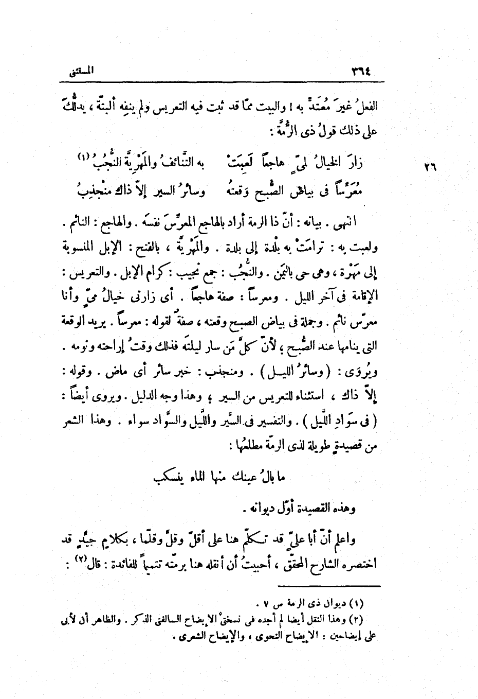 وَالتَّفْسِير فِي السّير وَاللَّيْل والسواد سَوَاء. وَهَذَا الشّعْر من قصيدة طَوِيلَة لذِي الرمة مطْلعهَا: مَا بَال عَيْنك مِنْهَا المَاء ينسكب وَهَذِه القصيدة أول ديوانه.