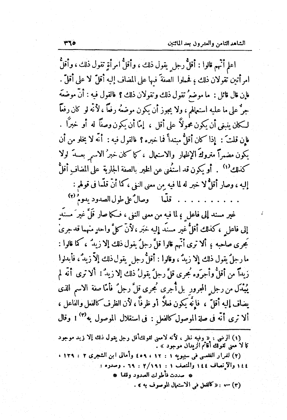 غير مُسْند إِلَى فَاعل لما فِيهِ من معنى النَّفْي فَكَمَا صَار قل غير مُسْند إِلَى فَاعل كَذَلِك أقل غير مُسْند إِلَى خبر لِأَن كل وَاحِد مِنْهُمَا قد جرى مجْرى صَاحبه أَلا ترى أَنهم قَالُوا قل رجل يَقُول ذَلِك إِلَّا وَيَد كَمَا قَالُوا: مَا رجل يَقُول ذَلِك إِلَّا زيد وَقَالُوا: أقل رجل يَقُول ذَلِك إِلَّا زيد فأبدلوا زيدا من أقل وأجروه مجْرى قل رجل يَقُول ذَلِك إِلَّا زيد أَلا ترى أَنه لم يُبدل من رجل الْمَجْرُور بل أجري مجْرى قل رجل فَأَما صفة الِاسْم الَّذِي يُضَاف إِلَيْهِ أقل فَإِنَّهُ يكون فعلا أَو ظرفا لِأَن الظّرْف كالفعل وَالْفَاعِل أَلا ترى أَنه فِي صلَة الْمَوْصُول كالفعل: فِي اسْتِقْلَال الْمَوْصُول)