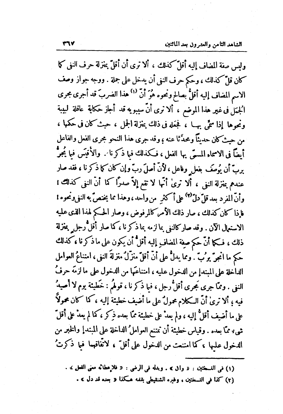 وَلَيْسَ صفة الْمُضَاف إِلَيْهِ أقل كَذَلِك أَلا ترى أَن أقل بِمَنْزِلَة حرف النَّفْي كَمَا كَانَ قل كَذَلِك وَحكم حرف النَّفْي أَن يدْخل على جملَة.