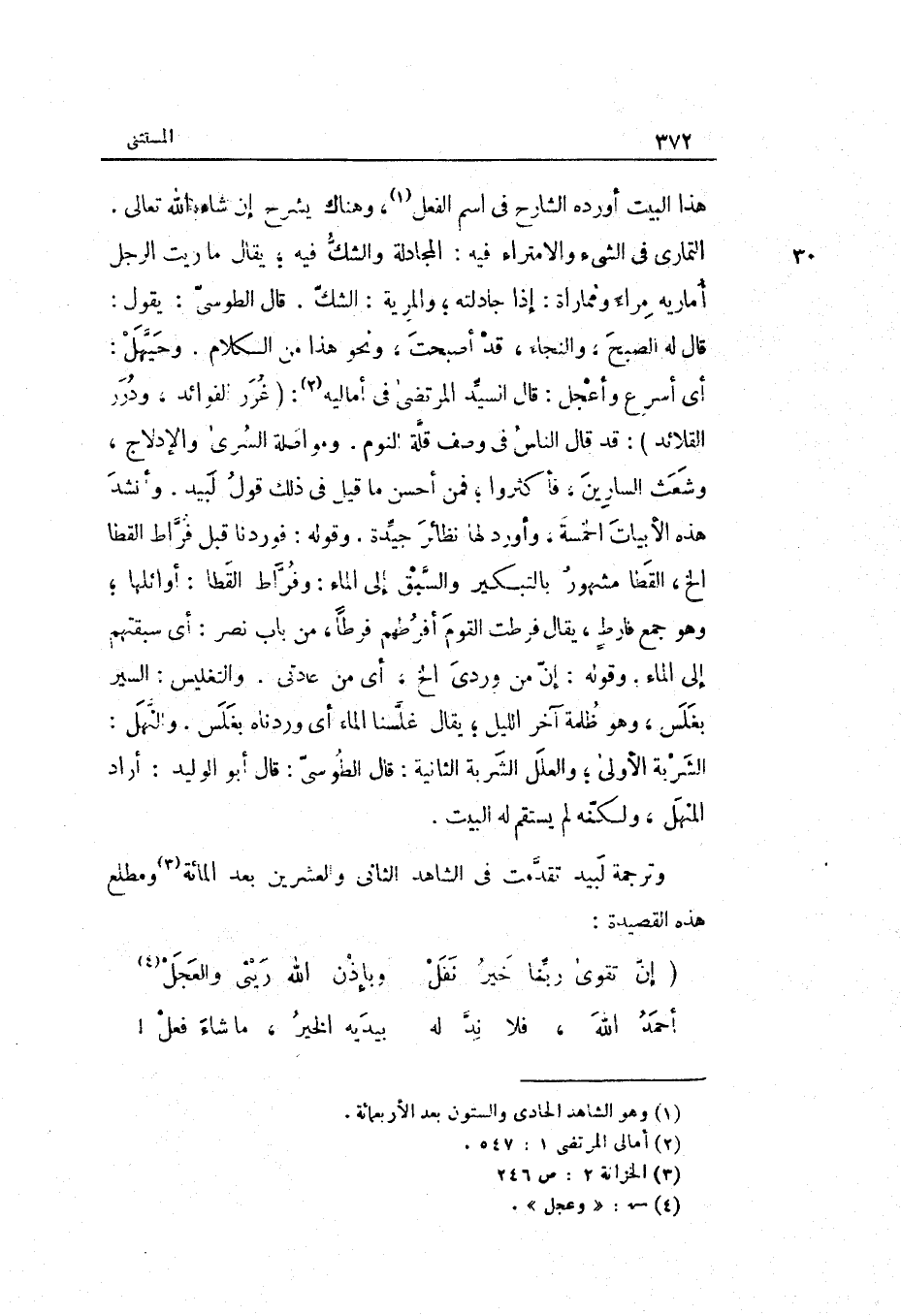 وَقَوله: إِن من وردي الخ أَي: من عادتي. والتغليس: السّير بِغَلَس وَهُوَ ظلمَة آخر اللَّيْل يُقَال: غلسنا المَاء أَي: وردناه بِغَلَس. والنهل: الشربة الأولى والعلل: الشربة الثَّانِيَة. قَالَ الطوسي: قَالَ وترجمة لبيد تقدّمت فِي الشَّاهِد الثَّانِي وَالْعِشْرين بعد الْمِائَة ومطلع هَذِه القصيدة: