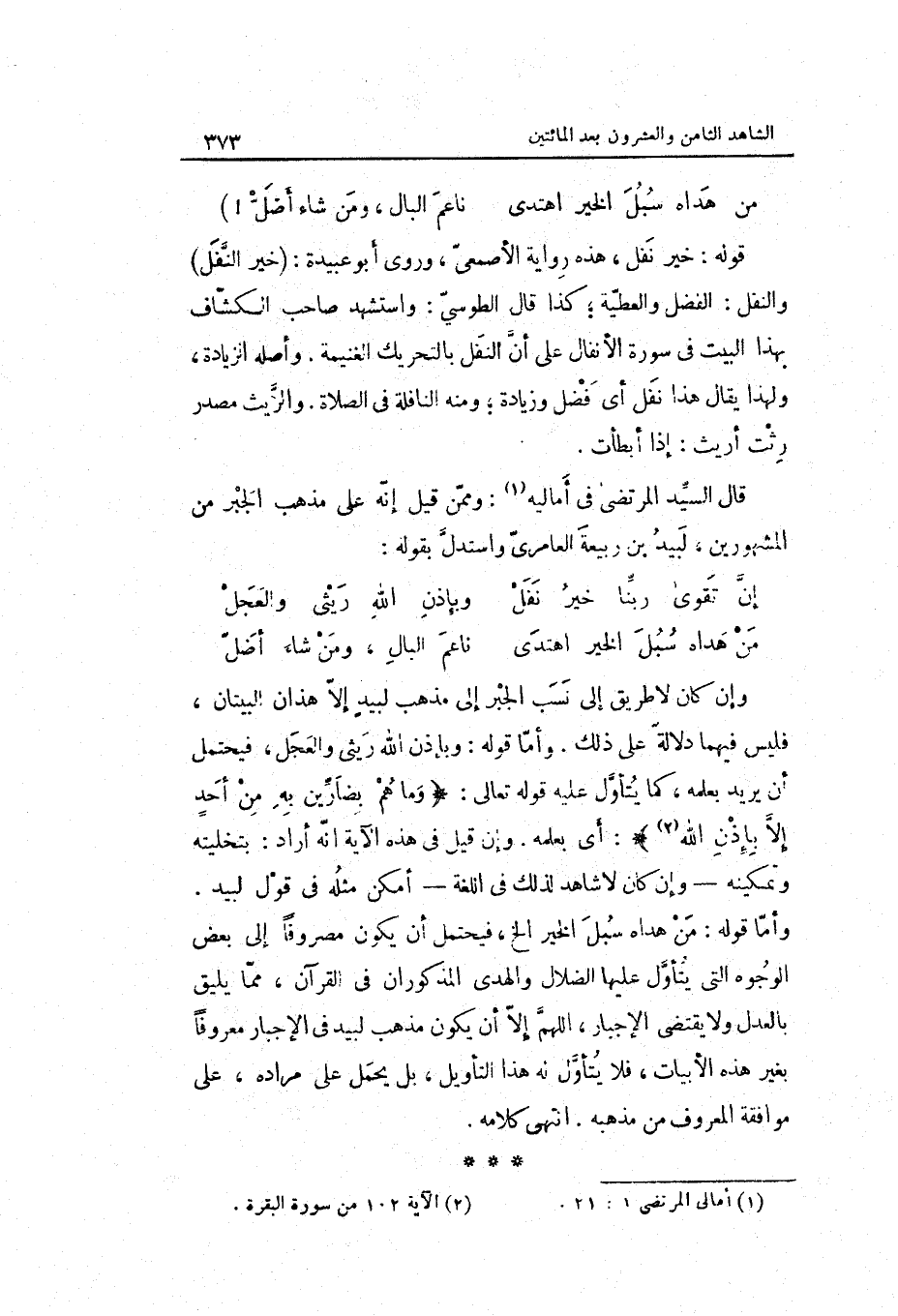 وَأما قَوْله: من هداه سبل الْخَيْر الخ فَيحْتَمل أَن يكون مصروفاً إِلَى بعض الْوُجُوه الَّتِي يتَأَوَّل عَلَيْهَا الضلال وَالْهدى الْمَذْكُورَان فِي الْقُرْآن مِمَّا يَلِيق بِالْعَدْلِ وَلَا يَقْتَضِي الْإِجْبَار اللَّهُمَّ إِلَّا أَن يكون مَذْهَب لبيد فِي الْإِجْبَار مَعْرُوفا بِغَيْر هَذِه الأبيات فَلَا يتَأَوَّل لَهُ هَذَا التَّأْوِيل بل يحمل على مُرَاده على مُوَافقَة الْمَعْرُوف من مذْهبه. انْتهى كَلَامه.