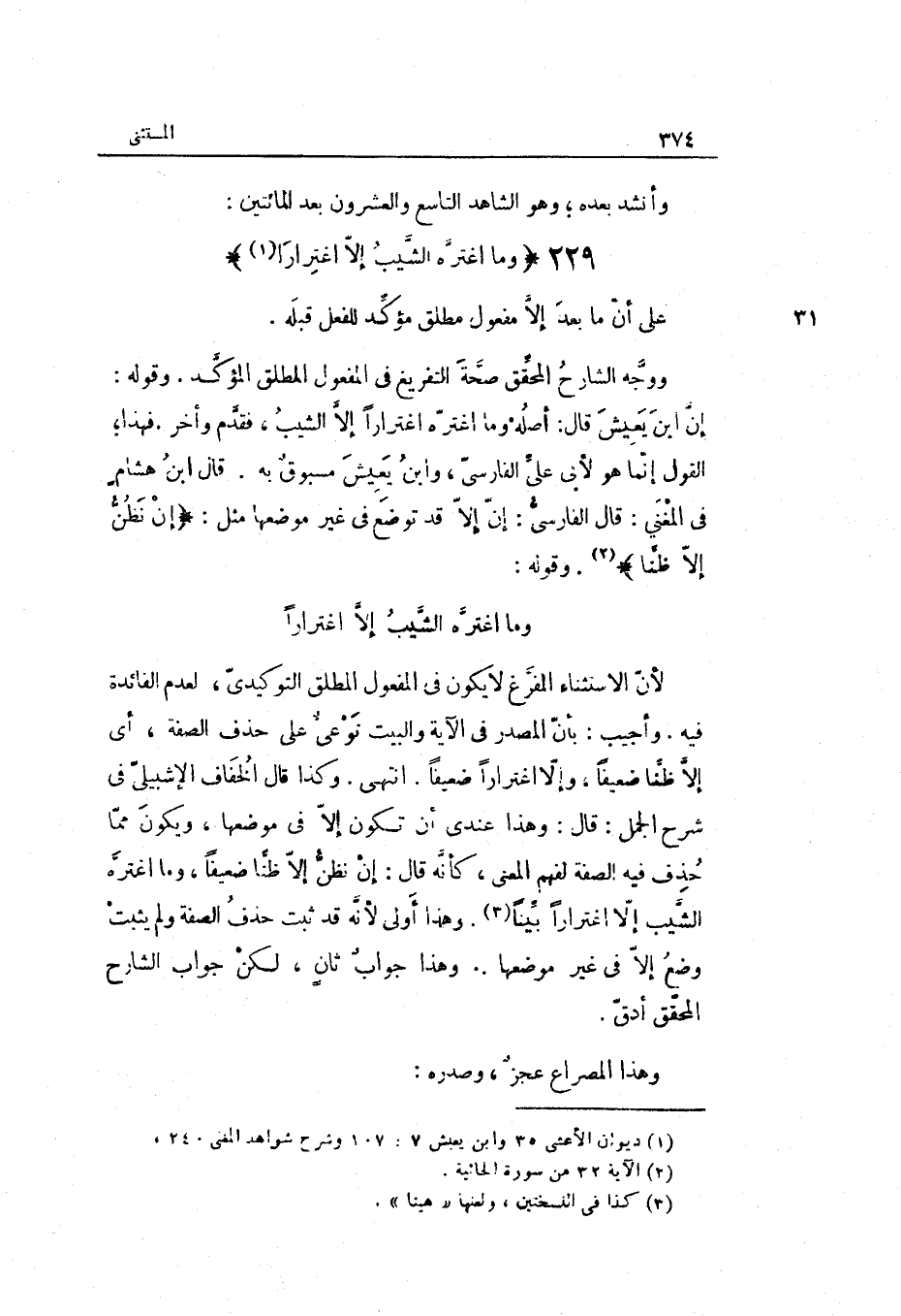 وَوجه الشَّارِح الْمُحَقق صِحَة التفريغ فِي الْمَفْعُول الْمُطلق الْمُؤَكّد. وَقَوله: إِن ابْن يعِيش قَالَ: أَصله وَمَا اغتره اغْتِرَارًا إِلَّا الشيب فَقدم وَأخر. فَهَذَا القَوْل إِنَّمَا هُوَ لأبي عَليّ الْفَارِسِي وَابْن يعِيش مَسْبُوق بِهِ. قَالَ ابْن هِشَام فِي الْمُغنِي: قَالَ الْفَارِسِي: إِن إِلَّا قد تُوضَع فِي غير موضعهَا مثل: إِن نظن إِلَّا ظنا. وَقَوله: لِأَن الِاسْتِثْنَاء المفرغ لَا يكون فِي الْمَفْعُول الْمُطلق التوكيدي لعدم الْفَائِدَة فِيهِ. وَأجِيب: بَان الْمصدر فِي الْآيَة وَالْبَيْت نَوْعي على حذف الصّفة أَي: إِلَّا ظنا ضَعِيفا وَإِلَّا اغْتِرَارًا ضَعِيفا.