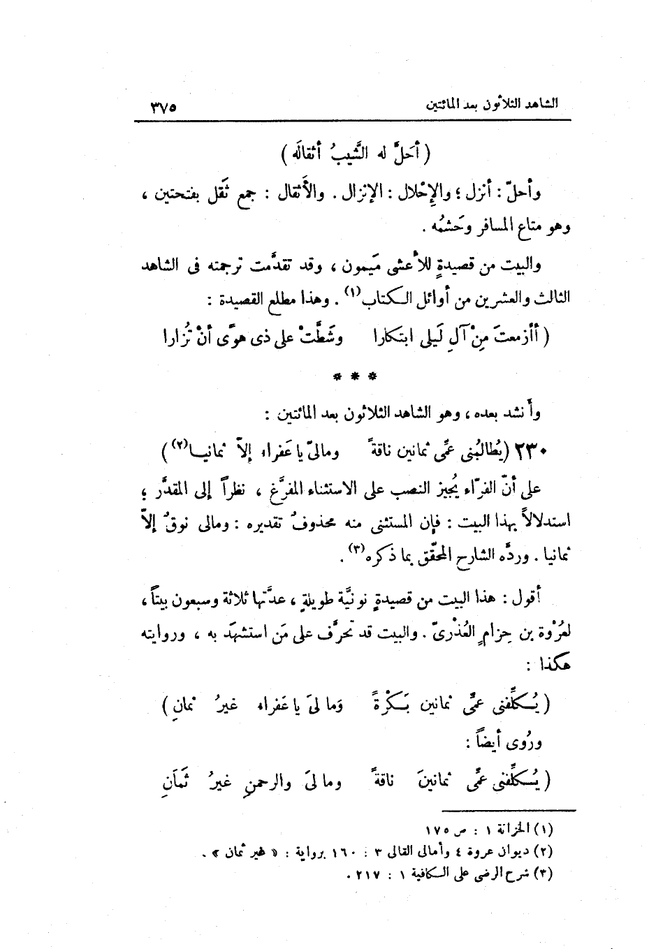 وَأنْشد بعده وَهُوَ الشَّاهِد الثَّلَاثُونَ بعد الْمِائَتَيْنِ على أَن الْفراء يُجِيز النصب على الِاسْتِثْنَاء المفرغ نظرا إِلَى الْمُقدر واستدلالاً بِهَذَا الْبَيْت. فَإِن الْمُسْتَثْنى مِنْهُ مَحْذُوف تَقْدِيره: وَمَالِي نُوق إِلَّا ثمانيا. ورده الشَّارِح الْمُحَقق بِمَا ذكره.