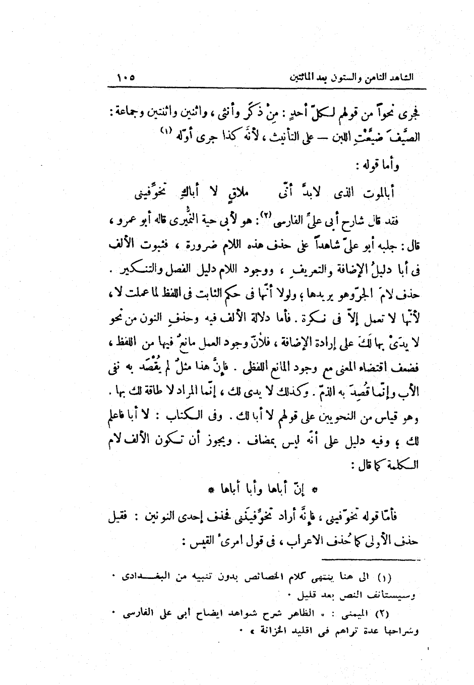 وَهُوَ قِيَاس من النّحويين على قَوْلهم لَا أَبَا لَك. وَفِي الْكتاب: لَا أَبَا فَاعْلَم لَك وَفِيه دَلِيل على أنّه لَيْسَ بمضاف. وَيجوز أَن تكون الْألف لَام الْكَلِمَة كَمَا قَالَ: الرجز فأمّا قَوْله تخوّفيني فإنّه أَرَادَ تخوفينني فَحذف إِحْدَى النونين: فَقيل حذف الأولى كَمَا حذف الْإِعْرَاب فِي قَول امْرِئ الْقَيْس: