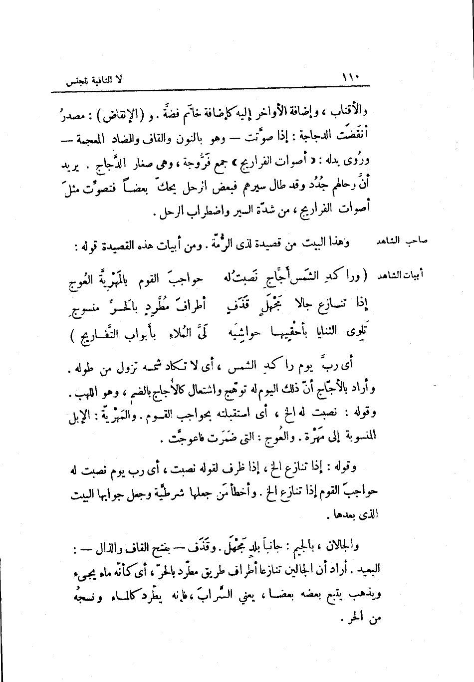 والأقتاب وَإِضَافَة الْأَوَاخِر إِلَيْهِ كإضافة خَاتم فضّة. والإنقاض: مصدر أنقضت الدّجاجة: إِذا صوّتت وَهُوَ بالنُّون وَالْقَاف وَالضَّاد الْمُعْجَمَة وَرُوِيَ بدله: أصوات الفراريج جمع فرّوجة وَهِي صغَار الدّجاج. يُرِيد أنّ رحالهم جدد وَقد طَال سيرهم فبعض الرحل يحكّ بَعْضًا فتصوّت مثل أصوات الفراريج من شدّة السّير واضطراب الرحل.