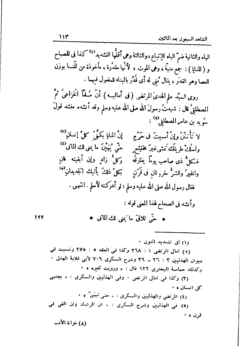 روى السيّد علم الْهدى المرتضى فِي أَمَالِيهِ أنّ مُسلما الخزاعيّ ثمّ المصطلقيّ قَالَ: شهِدت رَسُول الله صلّى الله عَلَيْهِ وسلّم وَقد أنْشدهُ منشد قَول سُوَيْد بن عَامر المصطلقي: الْبَسِيط