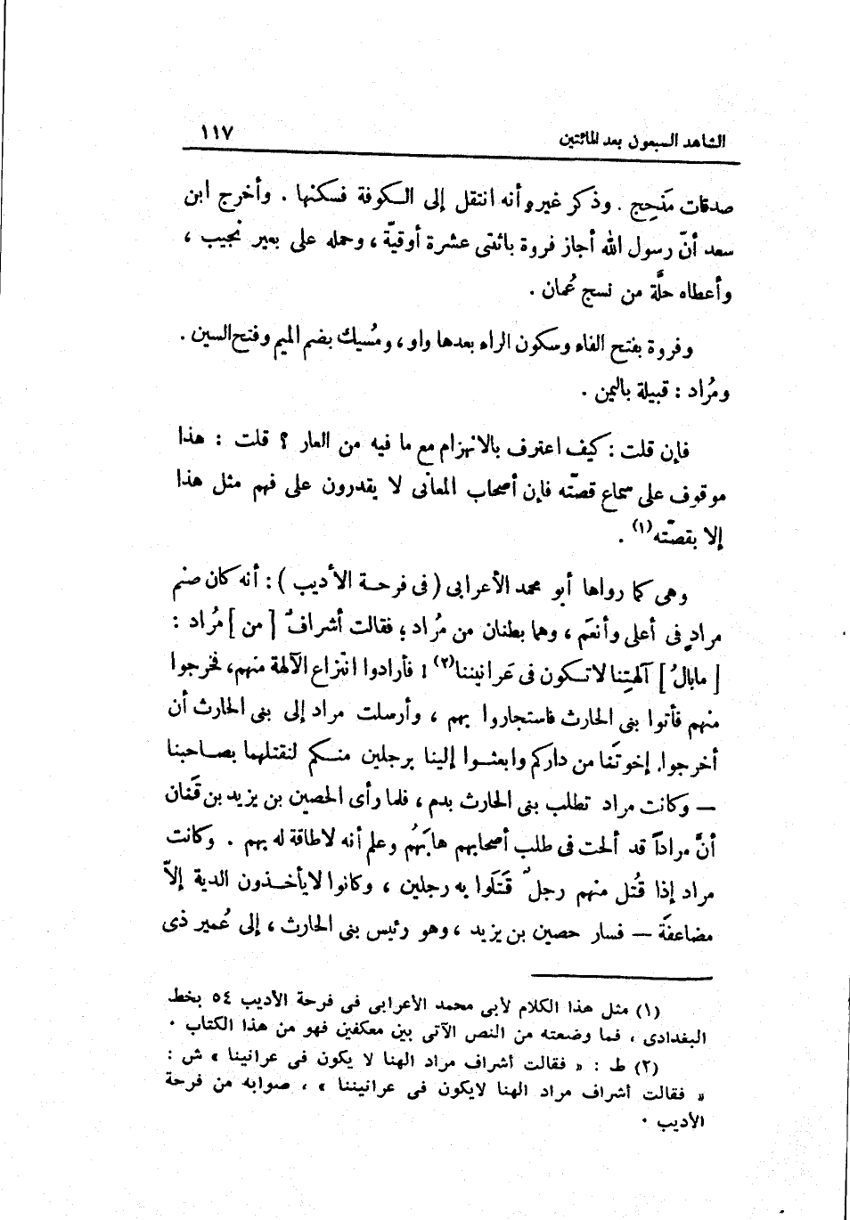 وَكَانَت مُرَاد إِذا قتل مِنْهُم رجلٌ قتلوا بِهِ رجلَيْنِ وَكَانُوا لَا يَأْخُذُونَ الدِّيَة إلاّ مضاعفة فَسَار حُصَيْن بن يزِيد وَهُوَ رَئِيس بني الْحَارِث إِلَى عُمَيْر ذِي