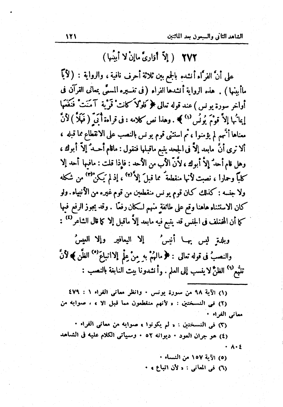 هَذِه الرِّوَايَة أنشدها الفرّاء فِي تَفْسِيره المسمّى بمعاني الْقُرْآن فِي أَوَاخِر سُورَة يُونُس عِنْد قَوْله تَعَالَى: فلولا كَانَت قَرْيَة آمَنت فنفعها إيمَانهَا إلاّ قوم يُونُس. وَهَذَا نَص كَلَامه: فِي قِرَاءَة أبيّ فهلاّ لأنّ مَعْنَاهَا أنّهم لم يُؤمنُوا ثمَّ اسْتثْنى قوم يُونُس بِالنّصب على الِانْقِطَاع مِمَّا قبله أَلا ترى أنّ مَا بعد إلاّ فِي الْجحْد يتبع مَا قبلهَا فَتَقول: مَا قَامَ أحدٌ إلاّ أَبوك لأنّ الْأَب من الْأَحَد: فَإِذا قلت: مَا فِيهَا أحد إلاّ كَلْبا وَحِمَارًا نصبت لأنّها منقطعةٌ مِمَّا قبل إلاّ إِذْ لم يكن من شكله وَلَا جنسه: كَذَلِك كَانَ قوم يُونُس منقطعين من قوم غَيره من الْأَنْبِيَاء.