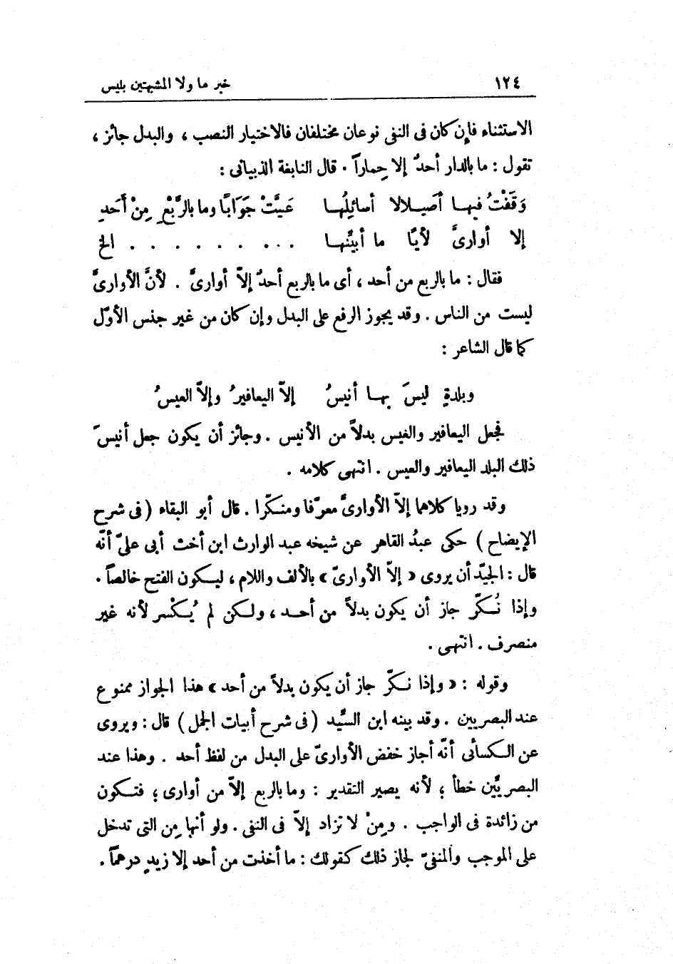 إلاّ أواريّ لأيّا مَا أبنيها ... ... ... ... . . الخ فَقَالَ: مَا بالربّع من أحد أَي: مَا بِالربعِ أحدٌ إلاّ أواريّ. لأنّ الأواريّ لَيست من النَّاس. وَقد يجوز الرّفْع على الْبَدَل وَإِن كَانَ من غير جنس الأوّل كَمَا قَالَ الشَّاعِر: