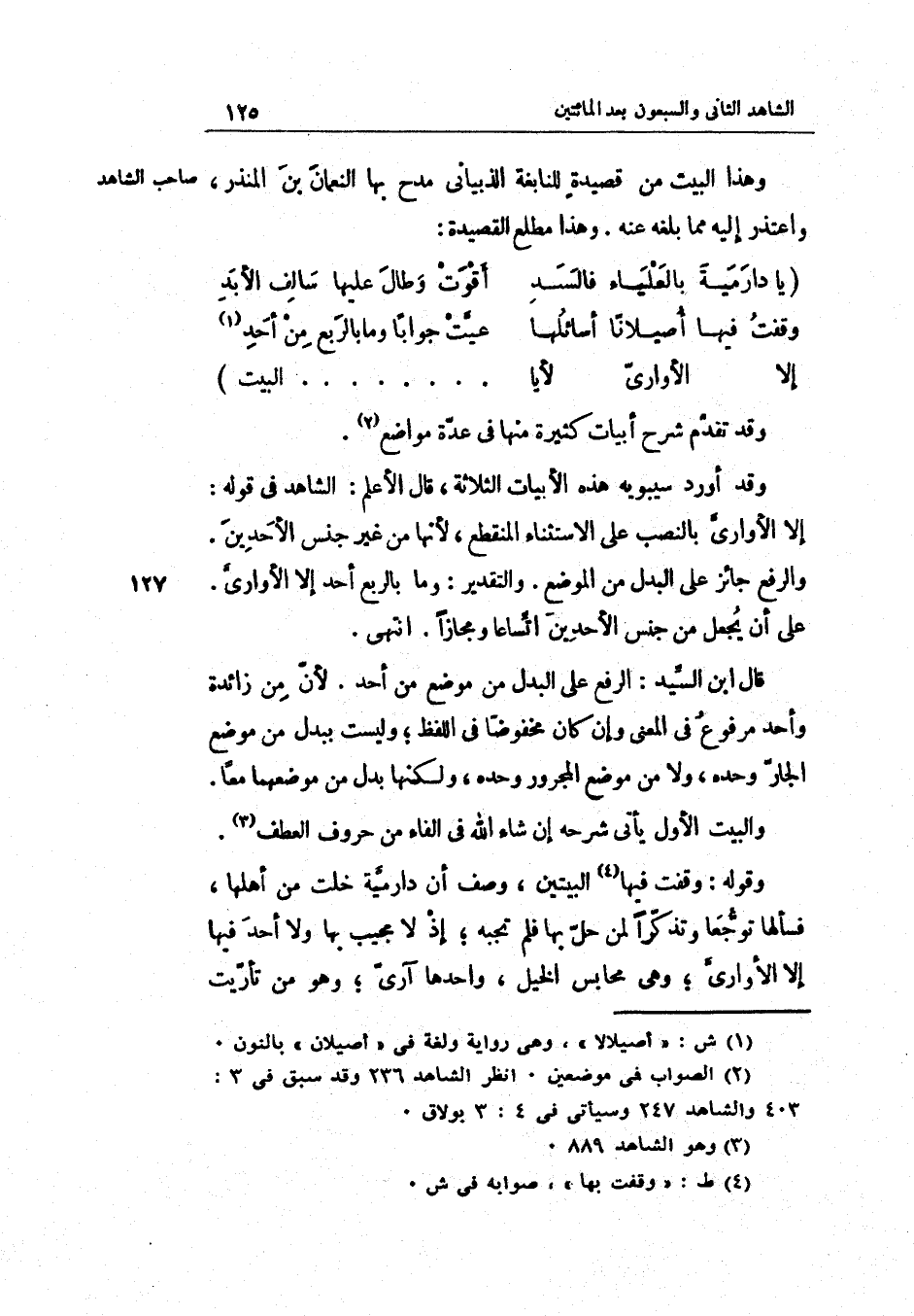 وَقد أورد سِيبَوَيْهٍ هَذِه الأبيات الثَّلَاثَة قَالَ الأعلم: الشَّاهِد فِي قَوْله: إلاّ الأواريّ بِالنّصب على الِاسْتِثْنَاء الْمُنْقَطع لأنّها من غير جنس الأحدين. وَالرَّفْع جَائِز على الْبَدَل من الْموضع.