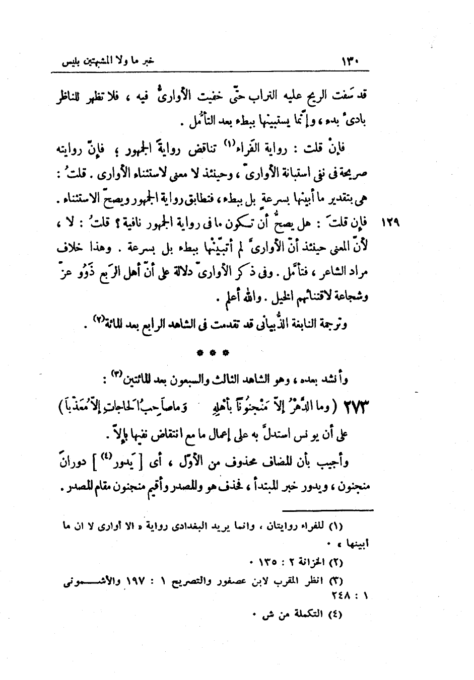 فَإِن قلت: هَل يصحّ مَا فِي رِوَايَة الْجُمْهُور نَافِيَة قلت: لَا لأنّ الْمَعْنى خينئذ أنّ الأواريّ لم أتبينّها ببطء بل بِسُرْعَة. وَهَذَا خلاف مُرَاد الشَّاعِر فتأمّل. وَفِي ذكر الأواريّ دلَالَة على أنّ أهل الرّبع ذَوُو عزّ وشجاعة لَا قتنائهم الْخَيل. وَالله أعلم.