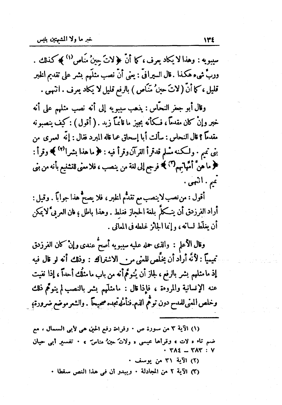 وَقَالَ أَبُو جَعْفَر النحّاس: يذهب سِيبَوَيْهٍ إِلَى أنّه نصب مثلهم على أنّه خبر وَإِن كَانَ مقدما فَكَأَنَّهُ يُجِيز مَا قَائِما زيد. أَقُول: كَيفَ ينصبونه مقدما قَالَ النحّاس: سَأَلت أَبَا إِسْحَاق عمّا قَالَه المبرّد فَقَالَ: إنّه لعمري من بني تَمِيم. وَلكنه مُسلم قد قَرَأَ الْقُرْآن وَقَرَأَ فِيهِ: مَا هنّ أمّهاتهم فَرجع إِلَى لُغَة من ينصب فَلَا معنى للتشنيع بِأَنَّهُ من بني تَمِيم. انْتهى.