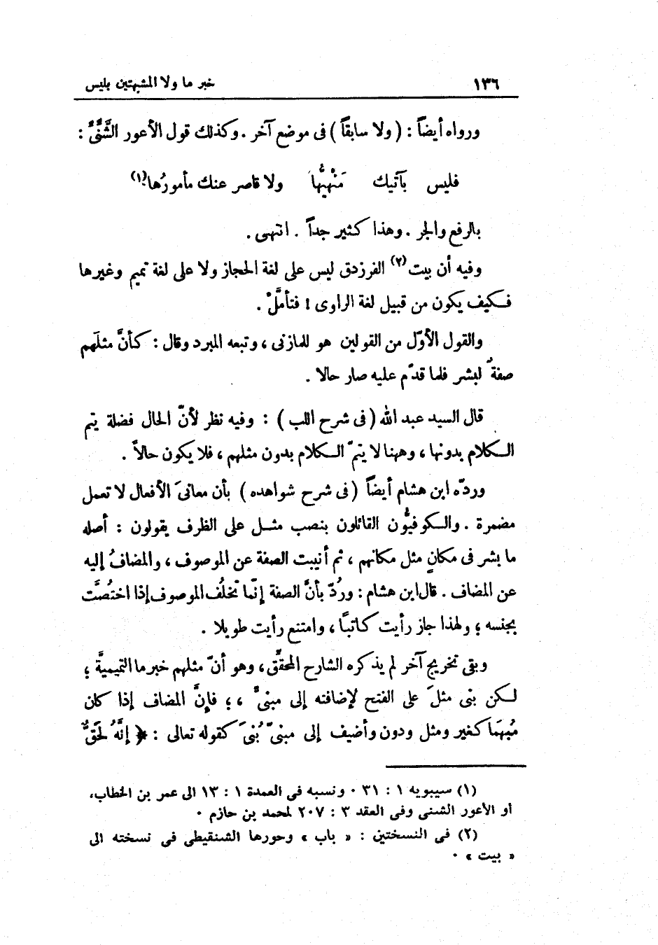 وردّه ابْن هِشَام أَيْضا فِي شرح شواهده بأنّ مَعَاني الْأَفْعَال لَا تعْمل مضمرة. والكوفّيون الْقَائِلُونَ بِنصب مثل على الظّرْف يَقُولُونَ: اصله مَا بشر فِي مكانٍ مثل مكانهم ثمَّ أنيبت الصّفة عَن الْمَوْصُوف والمضاف إِلَيْهِ عَن الْمُضَاف.