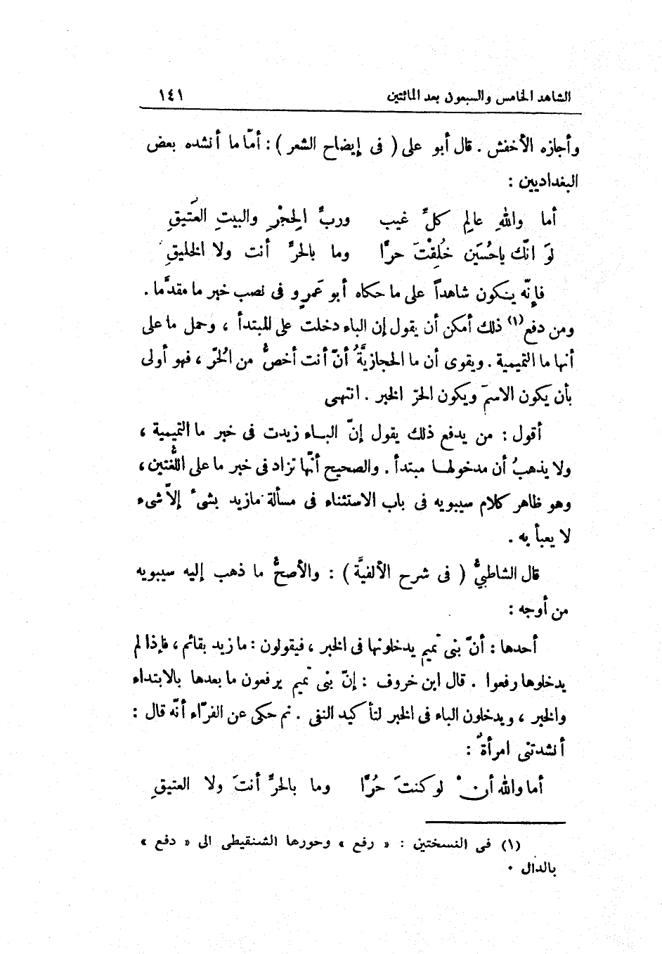 أَقُول: من يدْفع ذَلِك يَقُول: إنّ الْبَاء زيدت فِي خبر مَا التميمية وَلَا يذهب أَن مذخولها مُبْتَدأ. وَالصَّحِيح أنّها تزاد فِي خبر مَا على اللّغتين وَهُوَ ظاره كَلَام سِيبَوَيْهٍ فِي بَاب الِاسْتِثْنَاء فِي مَسْأَلَة مَا زيد بِشَيْء إلاّ شَيْء لَا يعبأ بِهِ.