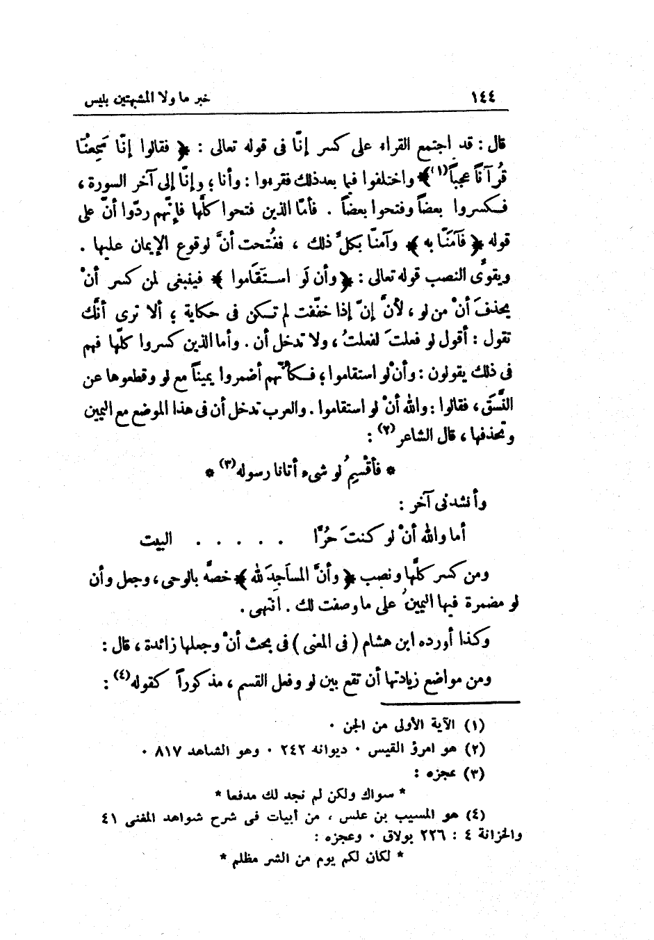 قَالَ: قد اجْتمع الفرّاء على كسر إنّا فِي قَوْله تَعَالَى: فَقَالُوا إنّا سمعنَا قُرْآنًا عجيباً وَاخْتلفُوا فِيمَا بعد ذَلِك فقرؤوا: وَأَنا وإنّا إِلَى آخر السُّورَة فكسروا بَعْضًا وفتحوا بَعْضًا. فأمّا الَّذين فتحُوا كلّها فإنّهم ردّوا أنّ على قَوْله: فَآمَنا بِهِ وآمنا بكلّ ذَلِك ففتحت أنّ لوُقُوع الْإِيمَان ويقويّ النصب قَوْله تَعَالَى: وَأَن لَو استقاموا فَيَنْبَغِي لمن كسر أَن يحذف أَن من لَو لأنّ إنّ إِذا خفّفت لم تكن فِي حِكَايَة أَلا ترى أنّك تَقول: أَقُول لَو فعلت لفَعَلت وَلَا تدخل أَن.