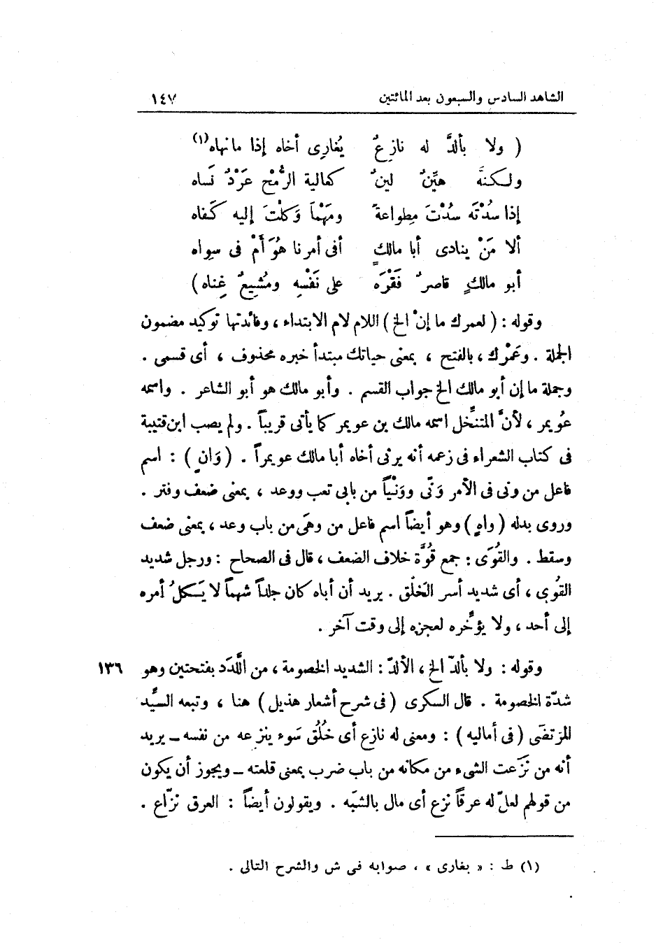 وَقَوله: لعمرك مَا إِن الخ اللَّام لَام الِابْتِدَاء وفائدتها توكيد مَضْمُون الْجُمْلَة. وعمرك بِالْفَتْح بِمَعْنى حياتك مُبْتَدأ خَبره مَحْذُوف أَي: قسمي. وَجُمْلَة مَا إِن أَبُو مَالك الخ جَوَاب الْقسم وأَبُو مَالك هُوَ أَبُو الشَّاعِر. واسْمه عُوَيْمِر لأنّ المتنخّل اسْمه مَالك بن عُوَيْمِر كَمَا يَأْتِي قَرِيبا.