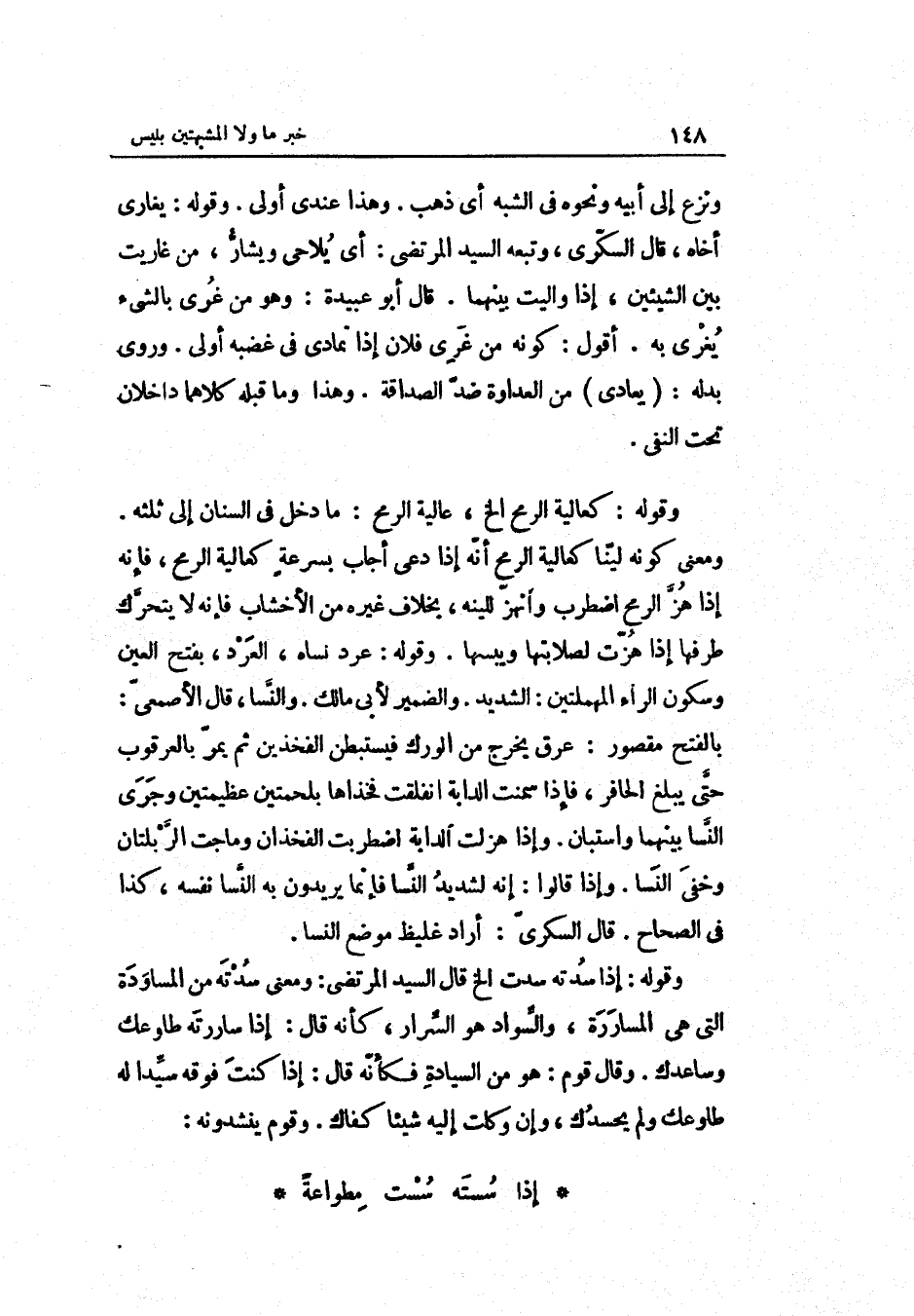 وَقَوله: إِذا سدته سدت الخ قَالَ السيّد المرتضى: وَمعنى سدته من المساودة الَّتِي هِيَ المساررة والسّواد هُوَ السّرار كَأَنَّهُ قَالَ: إِذا ساررته طاوعك وساعدك. وَقَالَ قوم: هُوَ من وَقوم ينشدونه: إِذا سسته سست مطواعةً