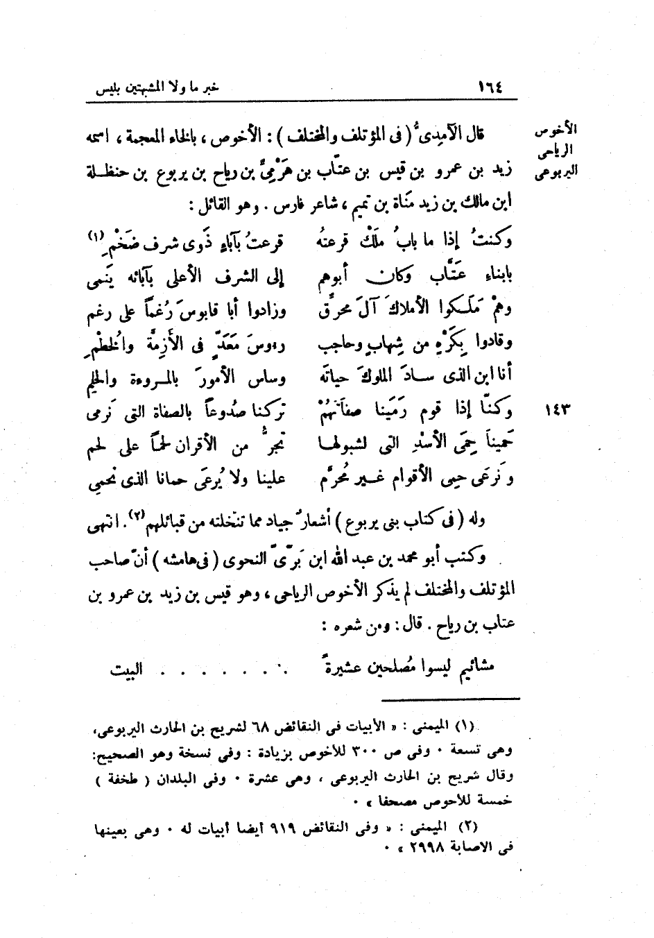 وَكتب أَبُو مُحَمَّد بن عبد الله ابْن برّيّ النّحوي فِي هامشه أنّ صَاحب المؤتلف والمختلف لم يذكر الأخوص الريَاحي وَهُوَ قيس بن زيد بن عَمْرو بن عتاب ابْن ريَاح. قَالَ: