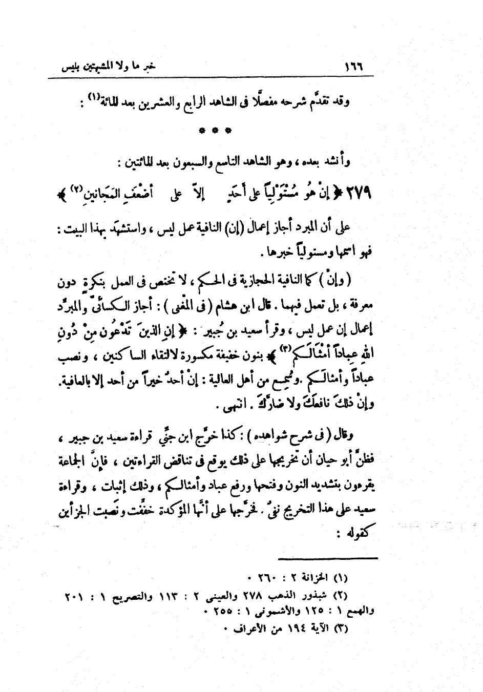 وَقَالَ فِي شرح شواهده: كَذَا خرّج ابْن جنّي قِرَاءَة سعيد بن جُبَير فظنّ أَبُو حيّان أَن تخريجها على ذَلِك يُوقع فِي تناقص الْقِرَاءَتَيْن فإنّ الْجَمَاعَة يقرؤون بتَشْديد النُّون وَفتحهَا وَرفع عباد وأمثالكم وَذَلِكَ إِثْبَات وَقِرَاءَة سعيد على هَذَا