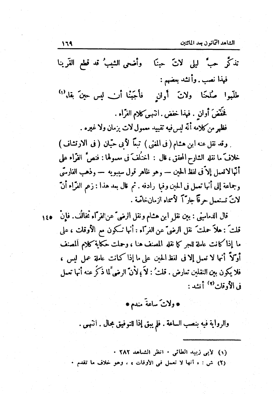 وَقد نقل عَنهُ ابْن هِشَام فِي الْمُغنِي تبعا لأبي حيّان فِي الارتشاف خلاف مَا نَقله الشَّارِح الْمُحَقق قَالَ: اخْتلف فِي معمولها: فنصّ الفرّاء على أَنَّهَا لَا تعْمل إلاّ فِي لفظ الْحِين وَهُوَ ظَاهر قَول سِيبَوَيْهٍ وَذهب الفارسيّ وَجَمَاعَة إِلَى أَنَّهَا تعملفي الْحِين وَفِيمَا رادفه. ثمَّ قَالَ بعد هَذَا: زعم الفرّاء أنّ لات تسْتَعْمل حرف جارّاً لأسماء الزَّمَان خَاصَّة.
