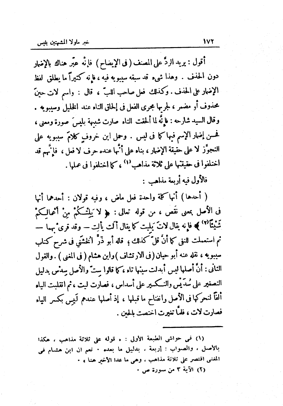 وَحمل ابْن خروف كَلَام سِيبَوَيْهٍ على التجوزّ لَا على حَقِيقَة الْإِضْمَار بِنَاء على أنّها عِنْده فَالْأول فِيهِ أَرْبَعَة مَذَاهِب: أَحدهَا: أَنَّهَا كلمة وَاحِدَة فعل مَاض وَفِيه قَولَانِ: أَحدهمَا أنّها فِي الأاصل بِمَعْنى نقص من قَوْله تَعَالَى: لَا يلتكم من أَعمالكُم شَيْئا فَإِنَّهُ يُقَال لات يليت كَمَا يُقَال ألت يألت وَقد قرئَ بهما ثمَّ اسْتعْملت للنَّفْي كَمَا أنّ قلّ كَذَلِك قَالَه أَبُو ذرّ الخشنيّ فِي شرح كتاب سِيبَوَيْهٍ نَقله)