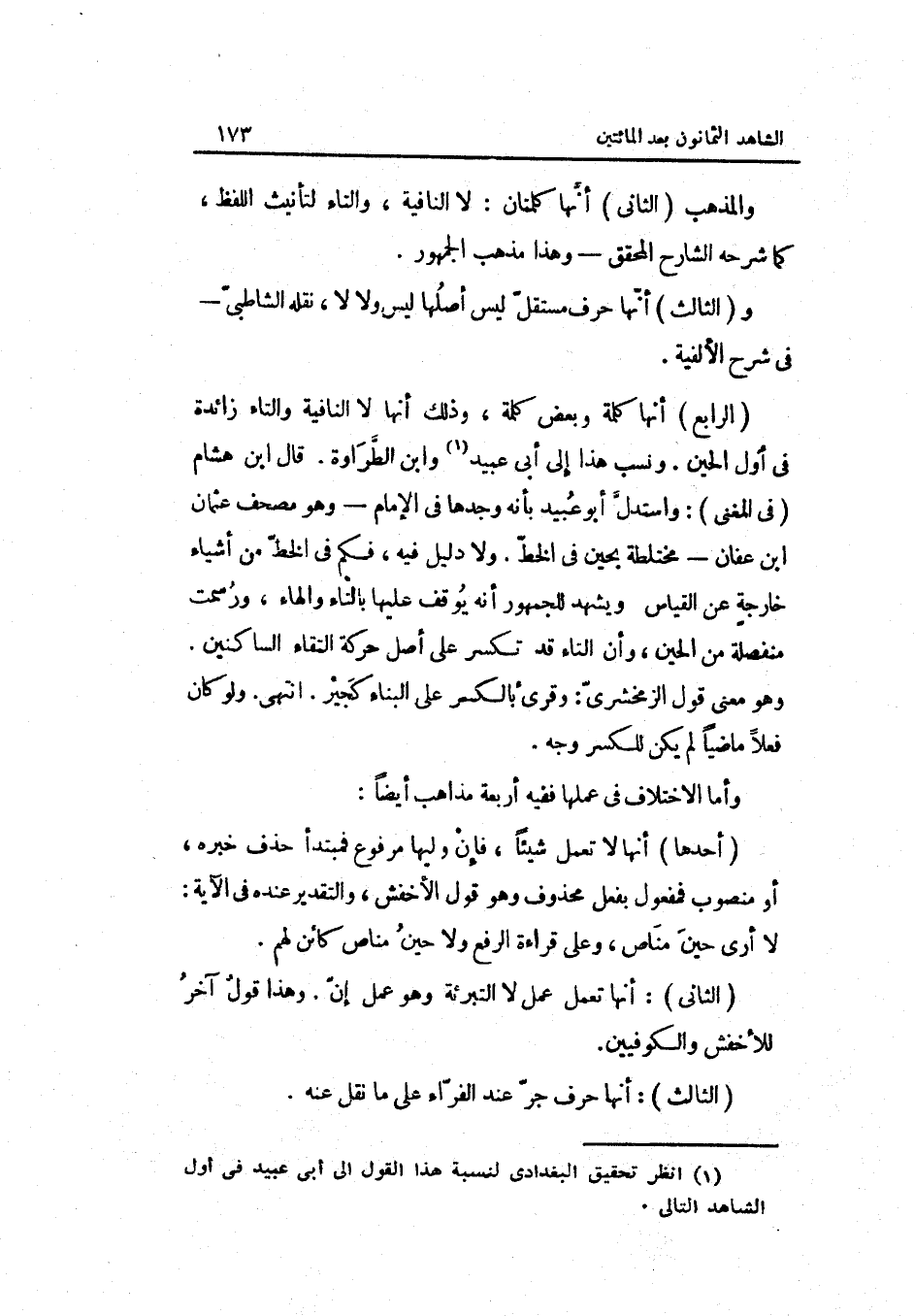 قَالَ ابْن هِشَام فِي المعني: واستدلّ أَبُو عبيد بأنّه وجدهَا فِي الإِمَام وَهُوَ مصحف عُثْمَان بن عفّان مختلطة بِحِين فِي الخطّ. وَلَا دَلِيل فِيهِ فِي الخطّ من أَشْيَاء خارجةٍ عَن الْقيَاس.