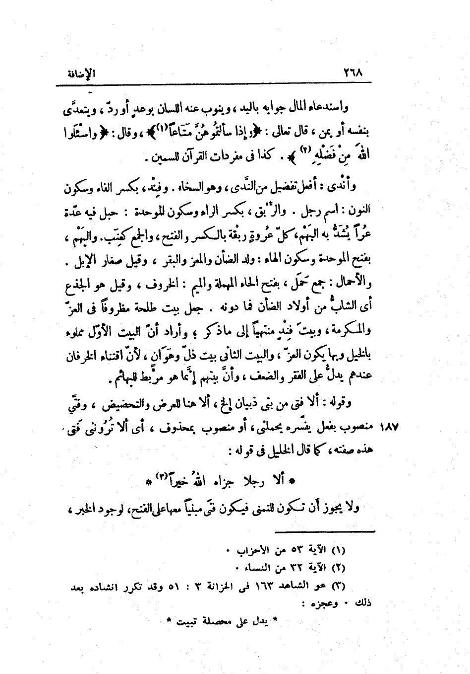 واستدعاء المَال جَوَابه بِالْيَدِ وتنوب عَنهُ اللِّسَان بوعدٍ أَو ردّ ويتعدّى بِنَفسِهِ أَو بِمن قَالَ تَعَالَى: وَإِذا سألتموهنّ مَتَاعا وَقَالَ: واسئلوا الله من فَضله. كَذَا فِي مُفْرَدَات الْقُرْآن للسمين. وأندى: أفعل تَفْضِيل من النّدى وَهُوَ السّخاء. وفند بِكَسْر الْفَاء وَسُكُون النُّون: اسْم رجل. والرّبق بِكَسْر الرَّاء وَسُكُون الْمُوَحدَة: حَبل فِيهِ عدّة يشدّ بِهِ البهم كلّ عروةٍ ربقة بِالْكَسْرِ وَالْفَتْح وَالْجمع كعنب. والبهم