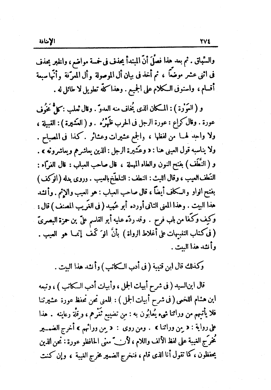 يحذف فِي خَمْسَة مَوَاضِع وَالْخَبَر يحذف فِي اثْنَي عشر موضعا ثمَّ أَخذ فِي بَيَان أل الموصولة وأل والْعَوْرَة: الْمَكَان الَّذِي يخَاف مِنْهُ العدوّ. وَقَالَ ثَعْلَب: كلّ مخوف عَورَة. وَقَالَ كرَاع: عَورَة الرجل فِي الْحَرْب ظَهره. والْعَشِيرَة: الْقَبِيلَة وَلَا وَاحِد لَهَا من لَفظهَا وَالْجمع عشيرات وعشائر.
