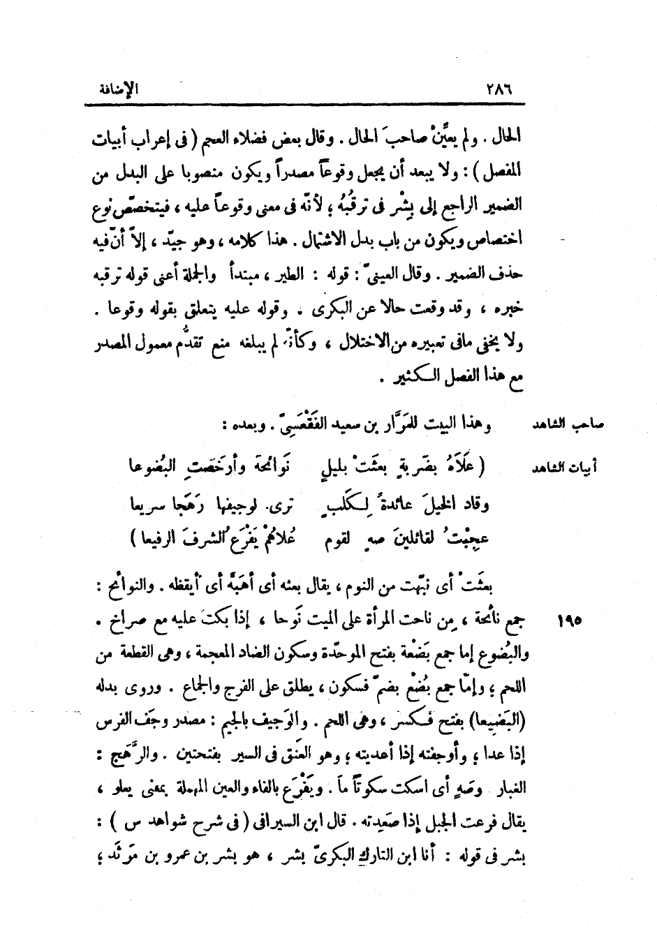 بعثت أَي: نبهت من النّوم يُقَال: بَعثه أَي: أهبّه أَي: أيقظه. والنوائح: جمع نائحة من ناحت الْمَرْأَة على الْمَيِّت نوحًا إِذا بَكت عَلَيْهِ مَعَ صُرَاخ. والبضوع إمّا جمع بضعَة بِفَتْح الْمُوَحدَة وَسُكُون الضَّاد الْمُعْجَمَة وَهِي الْقطعَة من اللَّحْم وإمّا جمع بضع بضمّ فَسُكُون يُطلق وَرُوِيَ بدله: البضيعا بِفَتْح فَكسر وَهِي اللَّحْم. والوجيف بِالْجِيم: مصدر وجف الْفرس إِذا عدا وأوجفته إِذا أعديته وَهُوَ الْعُنُق فِي السّير بِفتْحَتَيْنِ. والرّهج: الْغُبَار. وصهٍ أَي: اسْكُتْ سكُوتًا مَا. ويفرع بِالْفَاءِ وَالْعين الْمُهْملَة بِمَعْنى يَعْلُو يُقَال: فرعت الْجَبَل إِذا صعدته.