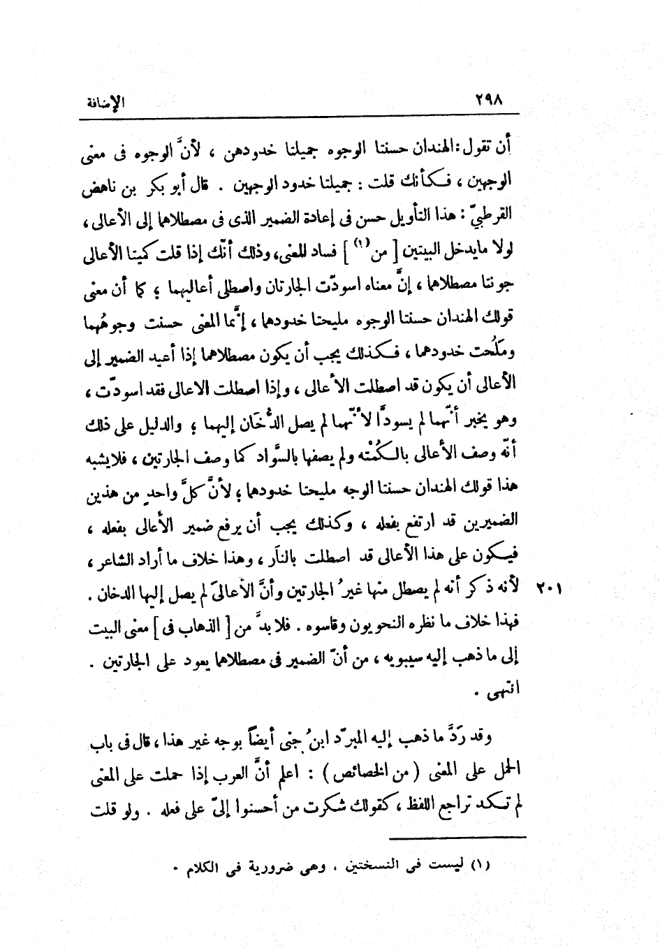 قَالَ أَبُو بكر بن ناهض القرطبيّ: هَذَا التَّأْوِيل حسن فِي إِعَادَة الضَّمِير الَّذِي فِي مصطلاهما إِلَى الأعالي لَوْلَا مَا يدْخل الْبَيْتَيْنِ من فَسَاد الْمَعْنى وَذَلِكَ أنّك إِذا قلت: كميتا الأعالي جونتا مصطلاهما إنّ مَعْنَاهُ اسودّت الجارتان واصطلى أعاليهما كَمَا أَن معنى قَوْلك الهندان حسنتا الْوُجُوه مليحتا خدودهما إنّما الْمَعْنى