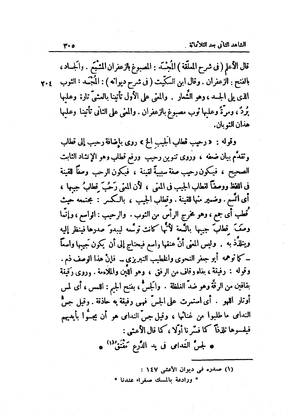 وَقَوله: رحيب قطاب الجيب الخ رُوِيَ بِإِضَافَة رحيب إِلَى قطاب وتقدّم بَيَان ضعفه وَرُوِيَ تَنْوِين رحيب وَرفع قطاب وَهُوَ الإنشاد الثَّابِت الصَّحِيح فَيكون رحيب صفة سَبَبِيَّة لقينة فَيكون الرحب وَصفا للقينة فِي اللَّفْظ ووصفاً لقطاب الجيب فِي الْمَعْنى لِأَن الْمَعْنى رحب قطاب جيبها أَي: اتّسع. وَضمير مِنْهَا للقينة. وقطاب الجيب بِالْكَسْرِ: مجتمعه حَيْثُ قطب أَي: جمع وَهُوَ مخرج الرَّأْس من الثَّوْب. والرّحيب: الْوَاسِع وإنّما وصف قطاب جيبها بالسّعة لأنّها كَانَت توسّعه ليبدو صدرها فَينْظر إِلَيْهِ ويتلذّذ بِهِ. وَلَيْسَ الْمَعْنى أنّ عُنُقهَا وَاسع فَيحْتَاج إلأى أَن يكون جيبها وَاسِعًا كَمَا توهمه أَبُو جَعْفَر النَّحْوِيّ والخطيب التّبريزيّ فإنّ هَذَا الْوَصْف ذمّ.