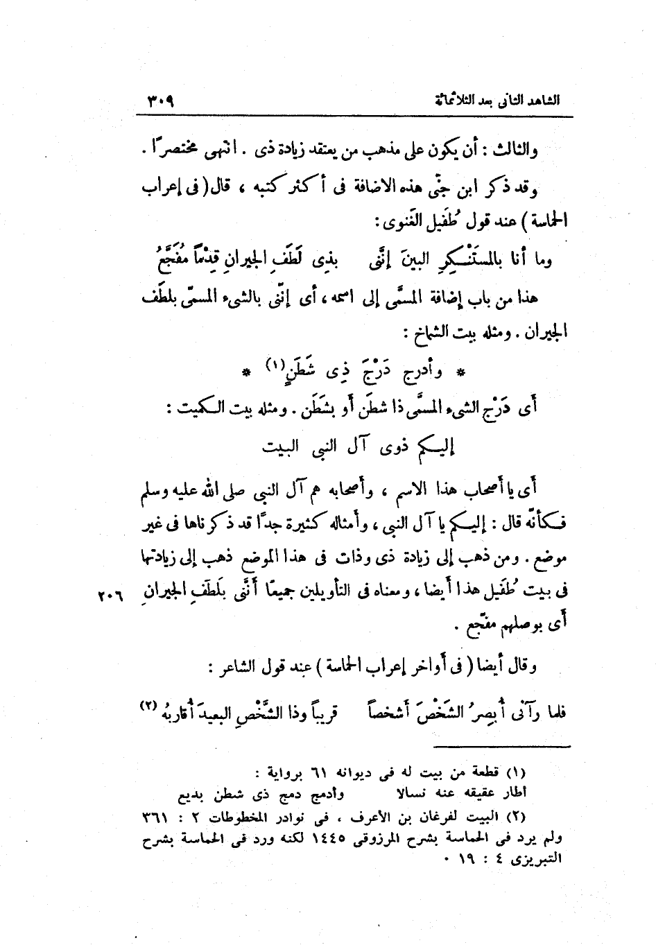 وأدرج درج ذِي شطنٍ وَمثله بَيت الْكُمَيْت: إِلَيْكُم ذَوي آل النَّبِي. . الْبَيْت أَي: يَا أَصْحَاب هَذَا الِاسْم واصحابه هم آل النبيّ صلّى عَلَيْهِ وَسلم فَكَأَنَّهُ قَالَ: إِلَيْكُم يَا آل النّبيّ وَأَمْثَاله كَثِيرَة جدا قد ذَكرنَاهَا فِي غير مَوضِع. وَمن ذهب إِلَى زِيَادَة ذِي وَذَات فِي هَذَا الْموضع ذهب إِلَى زيادتها فِي بَيت طفيل هَذَا أَيْضا وَمَعْنَاهُ فِي التَّأْويلَيْنِ جَمِيعًا أنّني بلطف الْجِيرَان أَي: بوصلهم مفجّع.