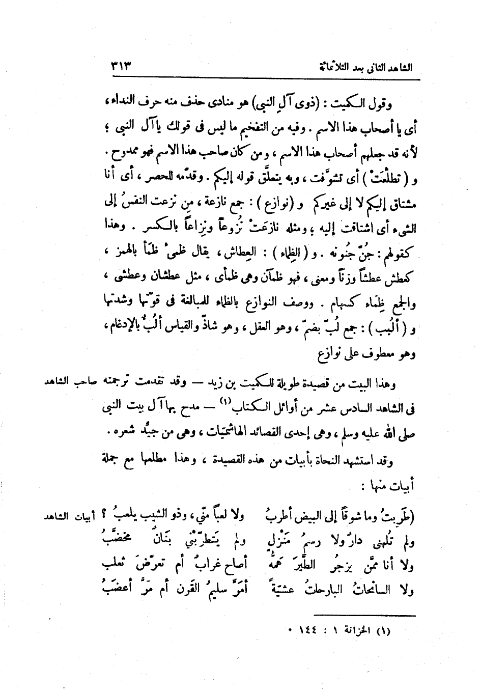 وَقَول الْكُمَيْت: ذَوي آل النَّبِي هُوَ منادى حذف مِنْهُ حرف النداء أَي: يَا أَصْحَاب هَذَا الِاسْم. وَفِيه من التفخيم مَا لَيْسَ فِي قَوْلك يَا آل النَّبِي لِأَنَّهُ قد جعلهم تشوّفت وَبِه يتعلّق قَوْله إِلَيْكُم. وقدّمه للحصر أَي: أَنا مشتاق إِلَيْكُم لَا إِلَى غَيْركُمْ. ونوزاع: جمع نازعة من نزعت النَّفس إِلَى الشَّيْء أَي: اشتاقت إِلَيْهِ وَمثله نازعت نزوعاً ونزاعاً بِالْكَسْرِ. وَهَذَا كَقَوْلِهِم: جنّ والظّماء: العطاش يُقَال: ظمئ ظمأ بِالْهَمْز كعطش عطشاً وزنا وَمعنى فَهُوَ ظمآن وَهِي ظمأى مثل عطشان وعطشى وَالْجمع ظماء كسهام. وَوصف النوازع بالظماء للْمُبَالَغَة فِي قوّتها وشدّتها. وألبب: جمع لبّ بضمّ وَهُوَ الْعقل وَهُوَ شاذّ وَالْقِيَاس ألبٌّ بِالْإِدْغَامِ وَهُوَ مَعْطُوف على نوازع.