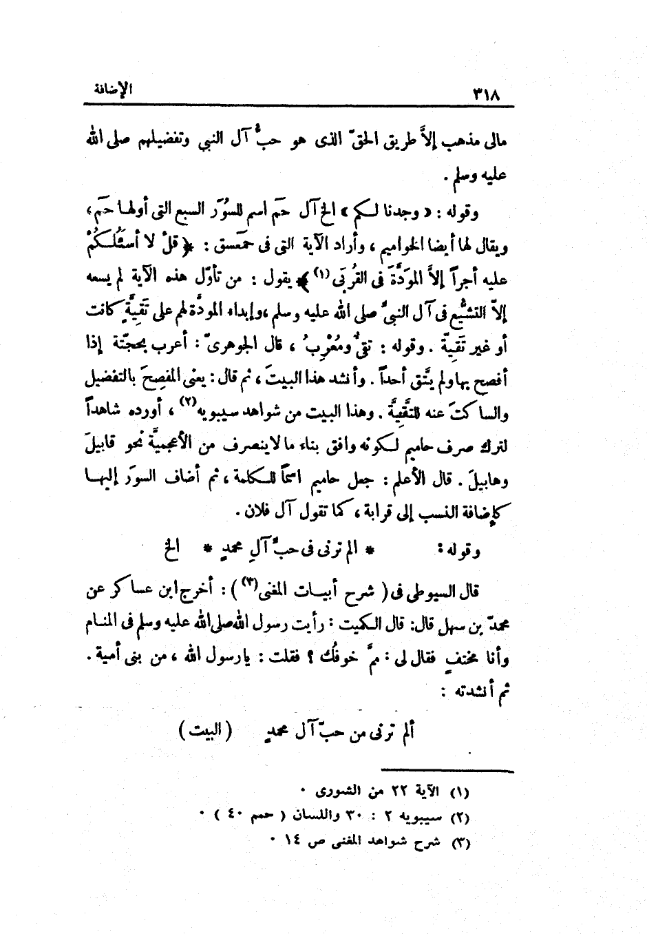 فِي الْقُرْبَى يَقُول: من تأوّل هَذِه الْآيَة لم يَسعهُ إلاّ التشيّع فِي آل النبيّ صلّى الله عَلَيْهِ وسلّم وإبداء المودّة لَهُم على تقيّةٍ كَانَت أَو غير تقيّة.